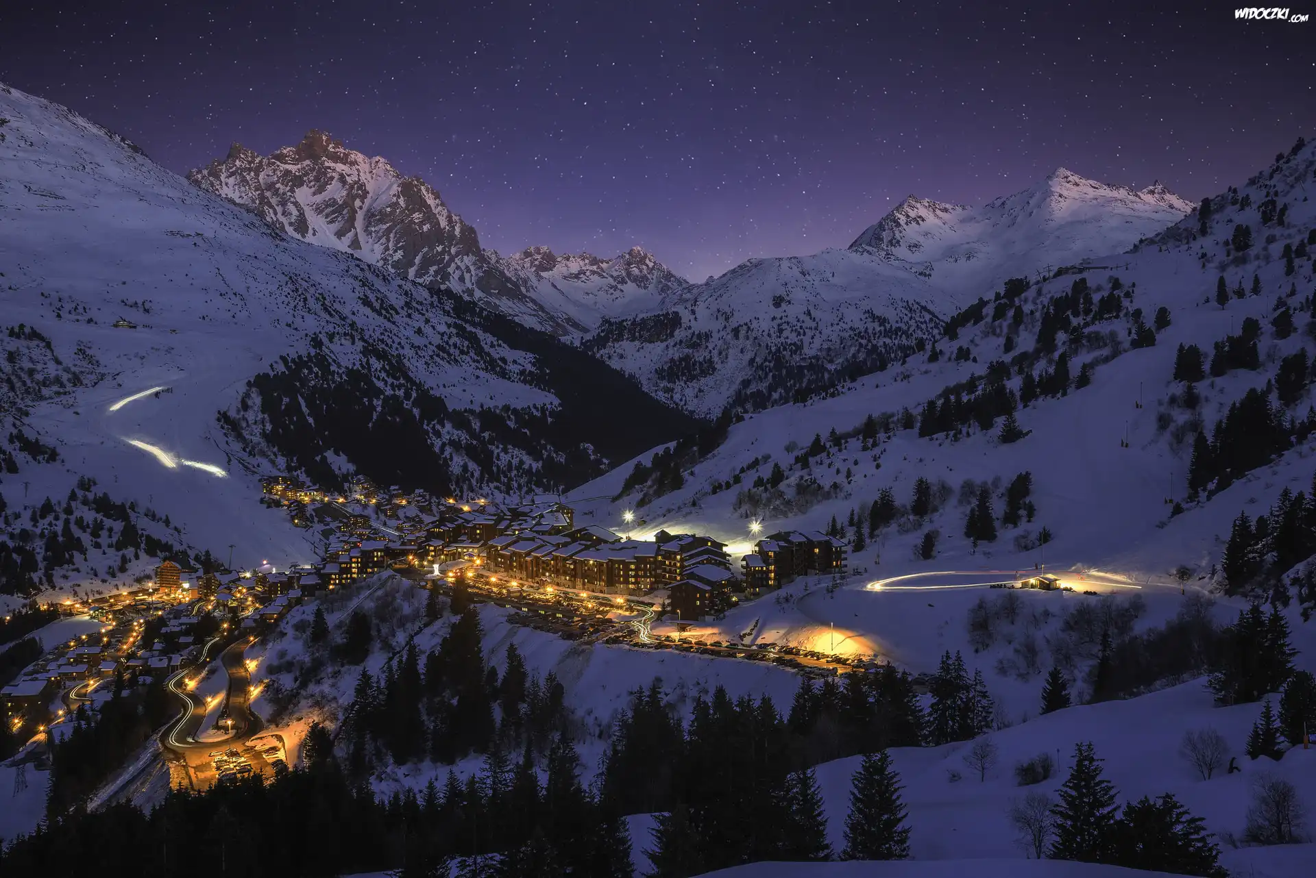 Francja, Region Rodan-Alpy, Meribel, Góry Alpy, Zima, Domy, Drzewa, Światła, Noc