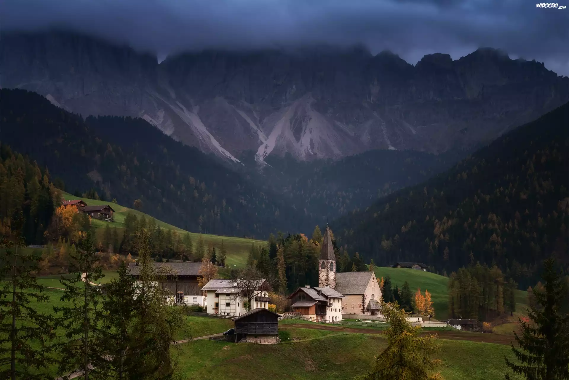 Góry, Dolomity, Las, Drzewa, Domy, Kościół, Chmury, Wieś, Santa Maddalena, Dolina Val di Funes, Włochy |