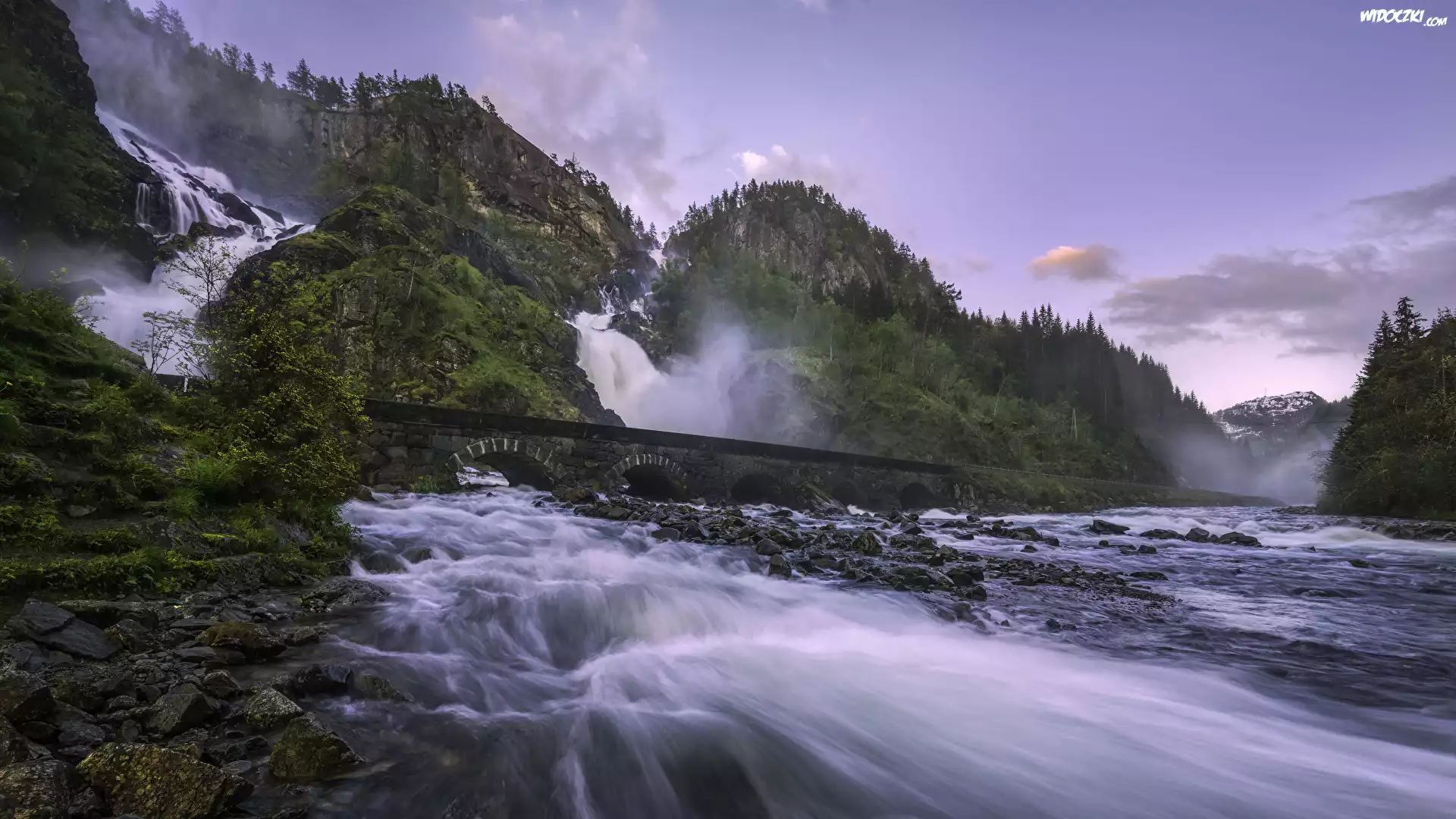 Zdjęcia, Wodospad Latefossen, Gmina Odda, Okręg Hordaland, Norwegia, Most, Góry
