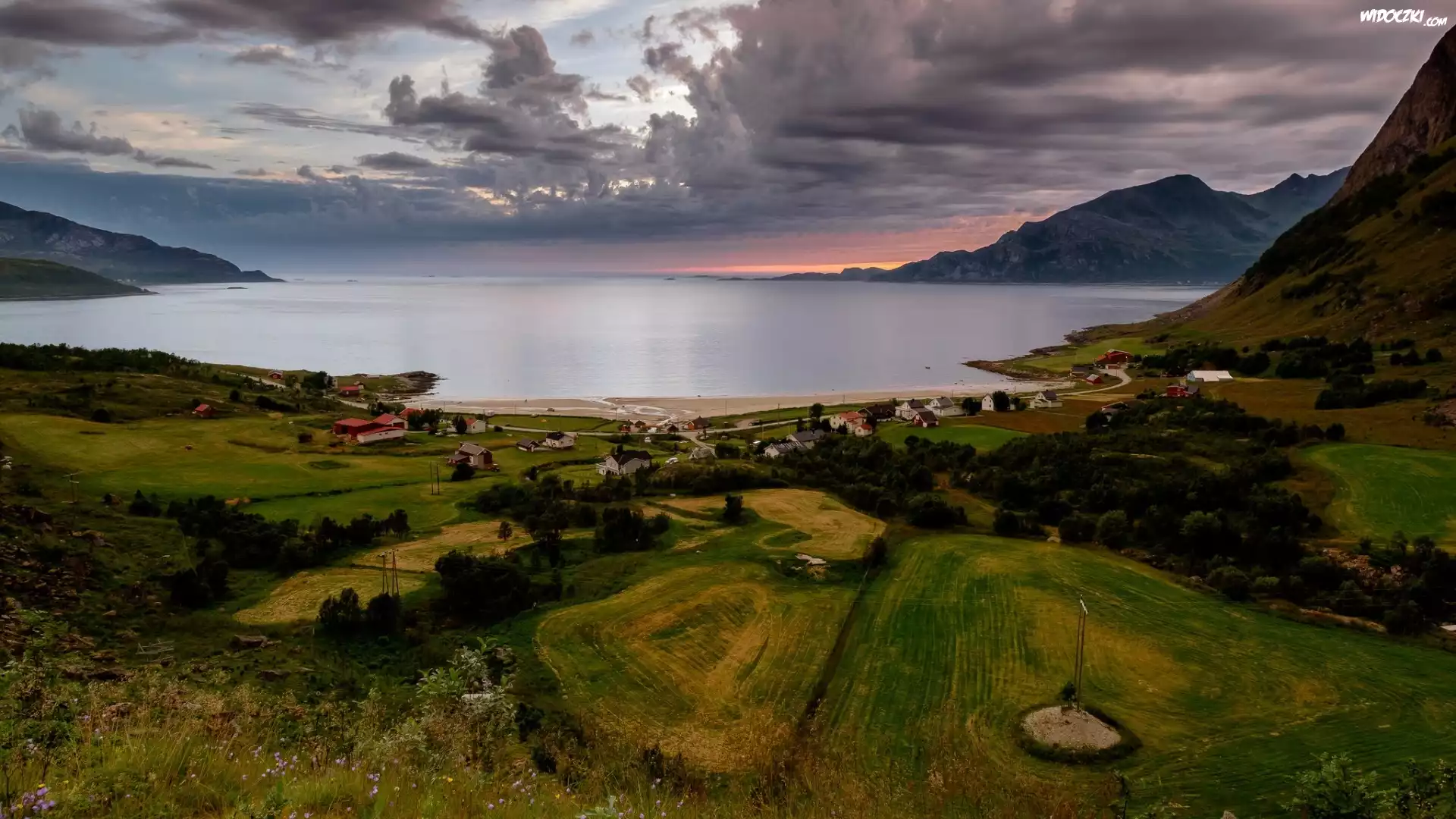 Zdjęcia, Norwegia, Wioska Grøtfjord, Pola, Drzewa, Fiord, Góry