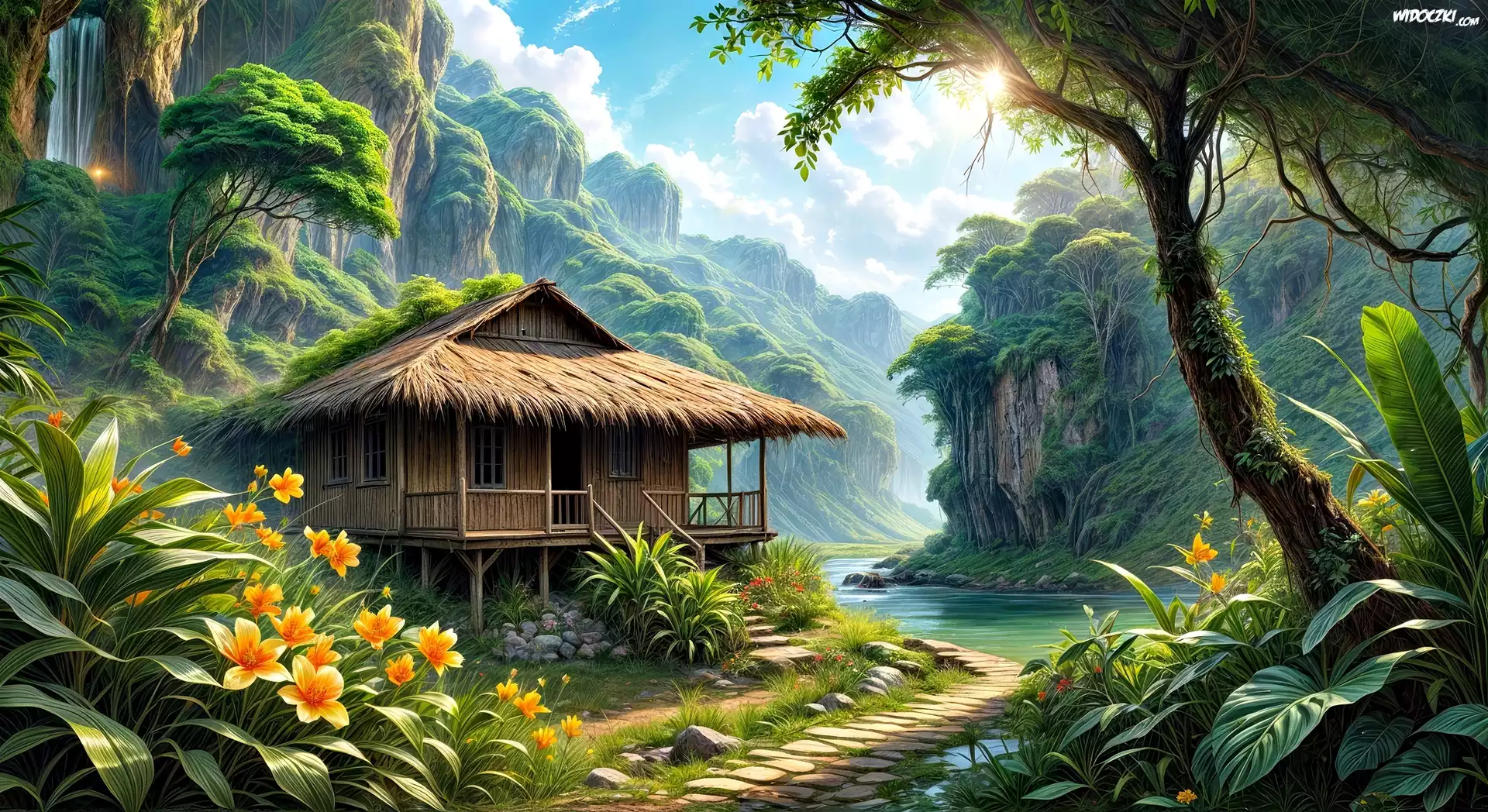 Kwiaty, Chata, Dom, Góry, Drzewa, Grafika