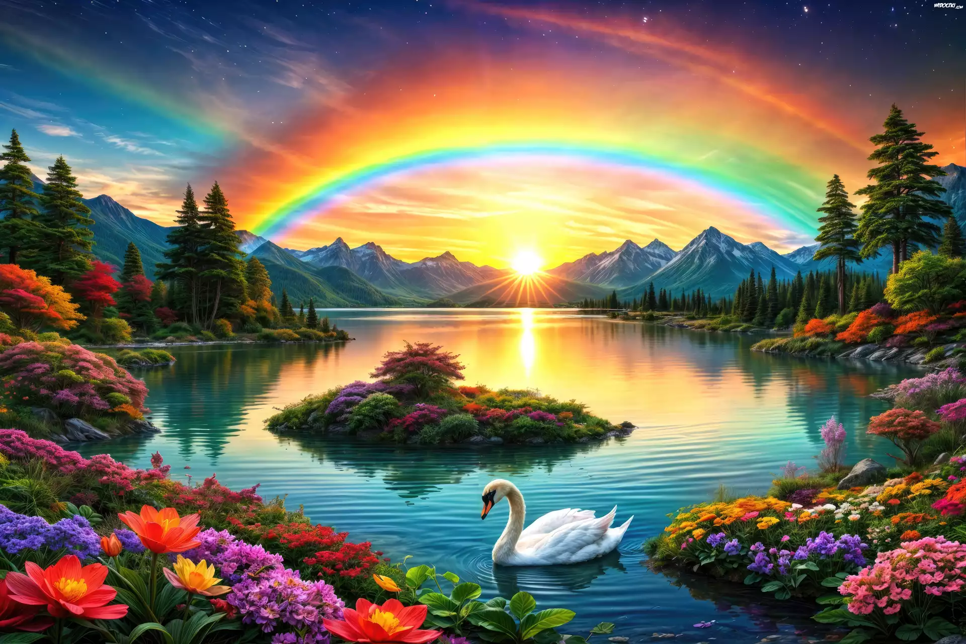 Kwiaty, Jezioro, Łabędź, Góry, Tęcza, Grafika