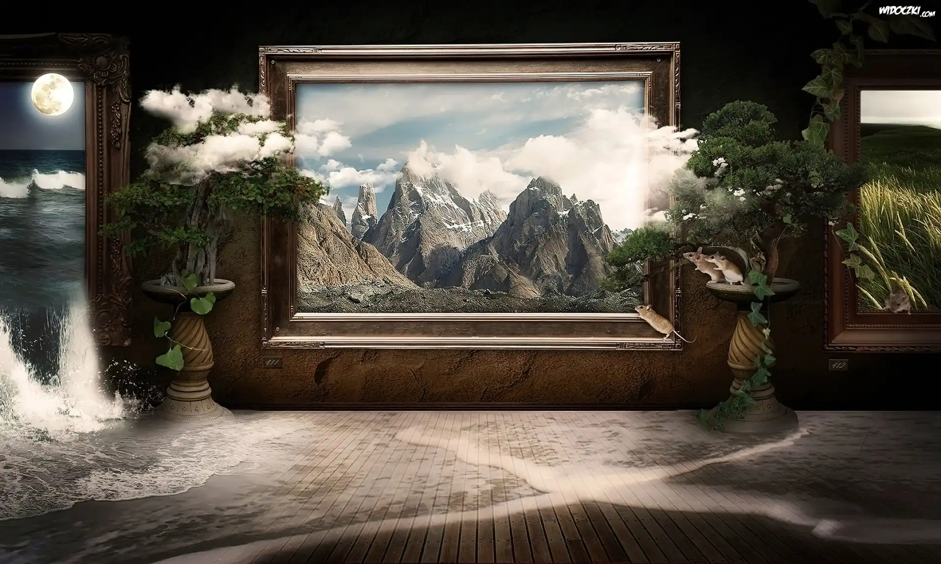 Góry, Chmury, Morze, Obrazy, Grafika, 4D