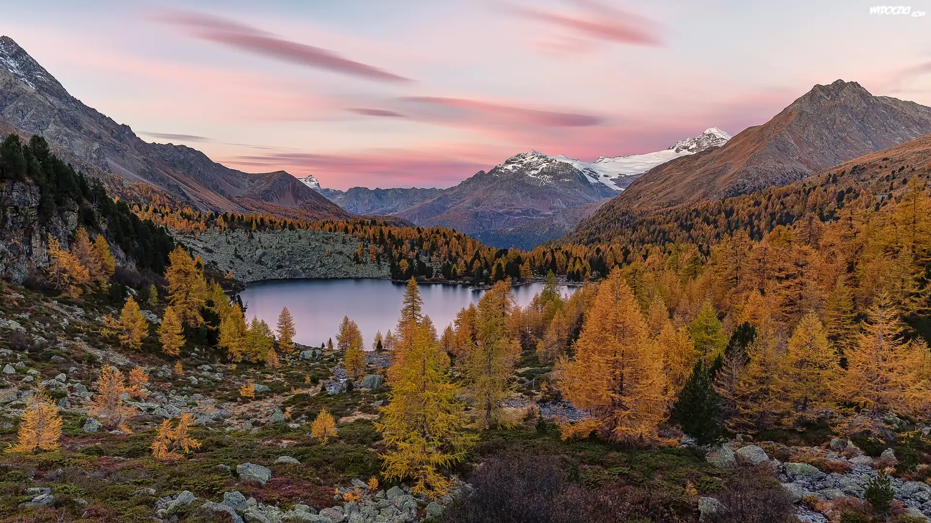 Góry, Jezioro Lagh da Val Viola, Las, Drzewa, Jesień, Dolina Val Poschiavo, Kanton Gryzonia, Szwajcaria |