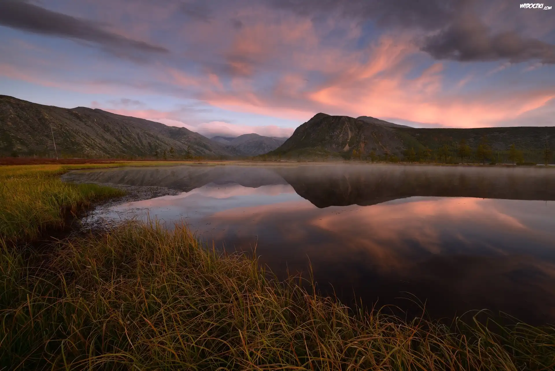 Góry, Trawa, Jezioro Jack London, Wschód słońca, Chmury, Odbicie, Kołyma, Obwód magadański, Rosja