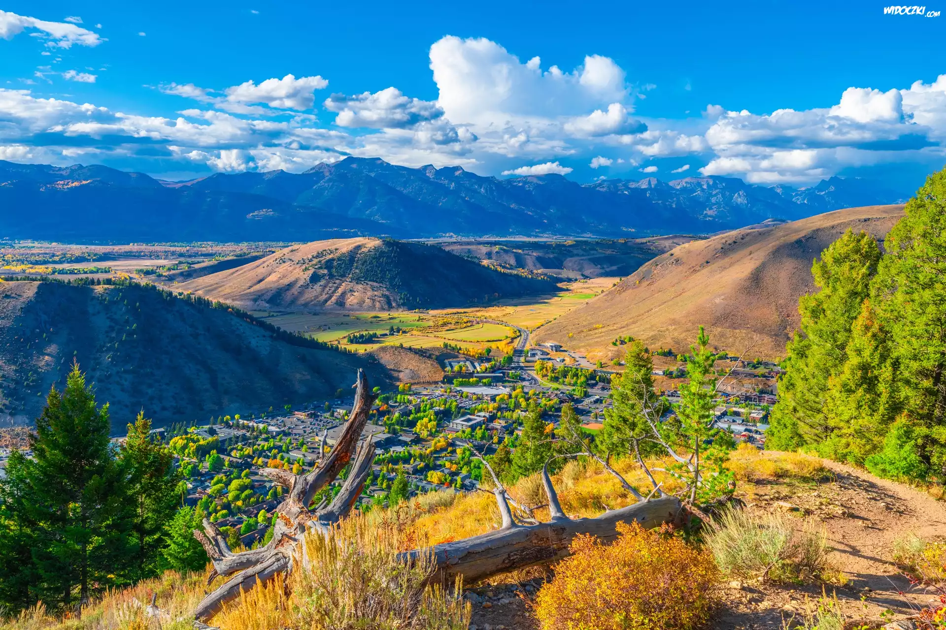 Konar, Dolina, Wzgórza, Góry, Teton Range, Niebo, Chmury, Miasto Jackson, Wyoming, Stany Zjednoczone |