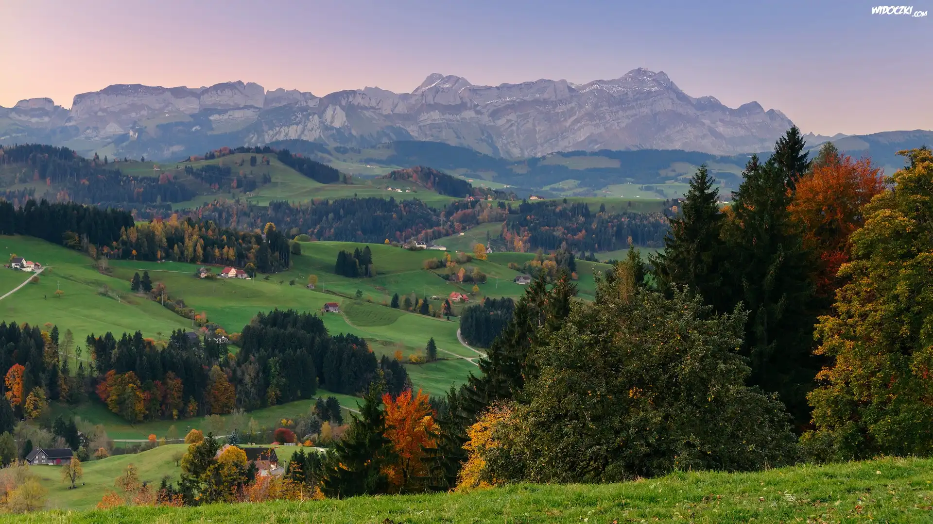 Góry, Lasy, Łąki, Domy, Jesień, Panorama
