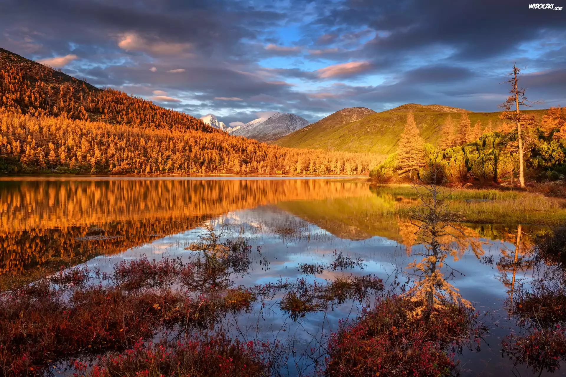 Góry, Jezioro, Las, Pożółkłe, Drzewa, Chmury, Jesień, Kołyma, Rosja