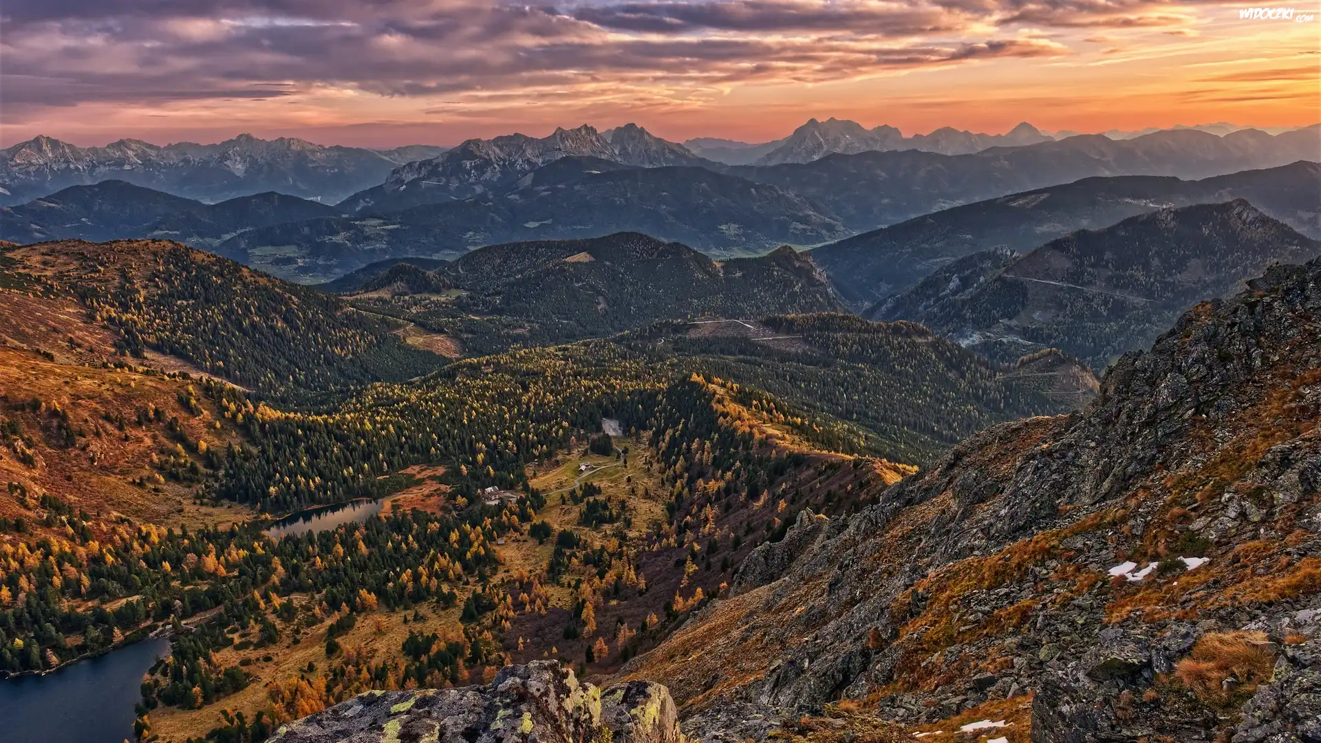 Jesień, Góry, Doliny, Zachód słońca, Drzewa, Jeziora