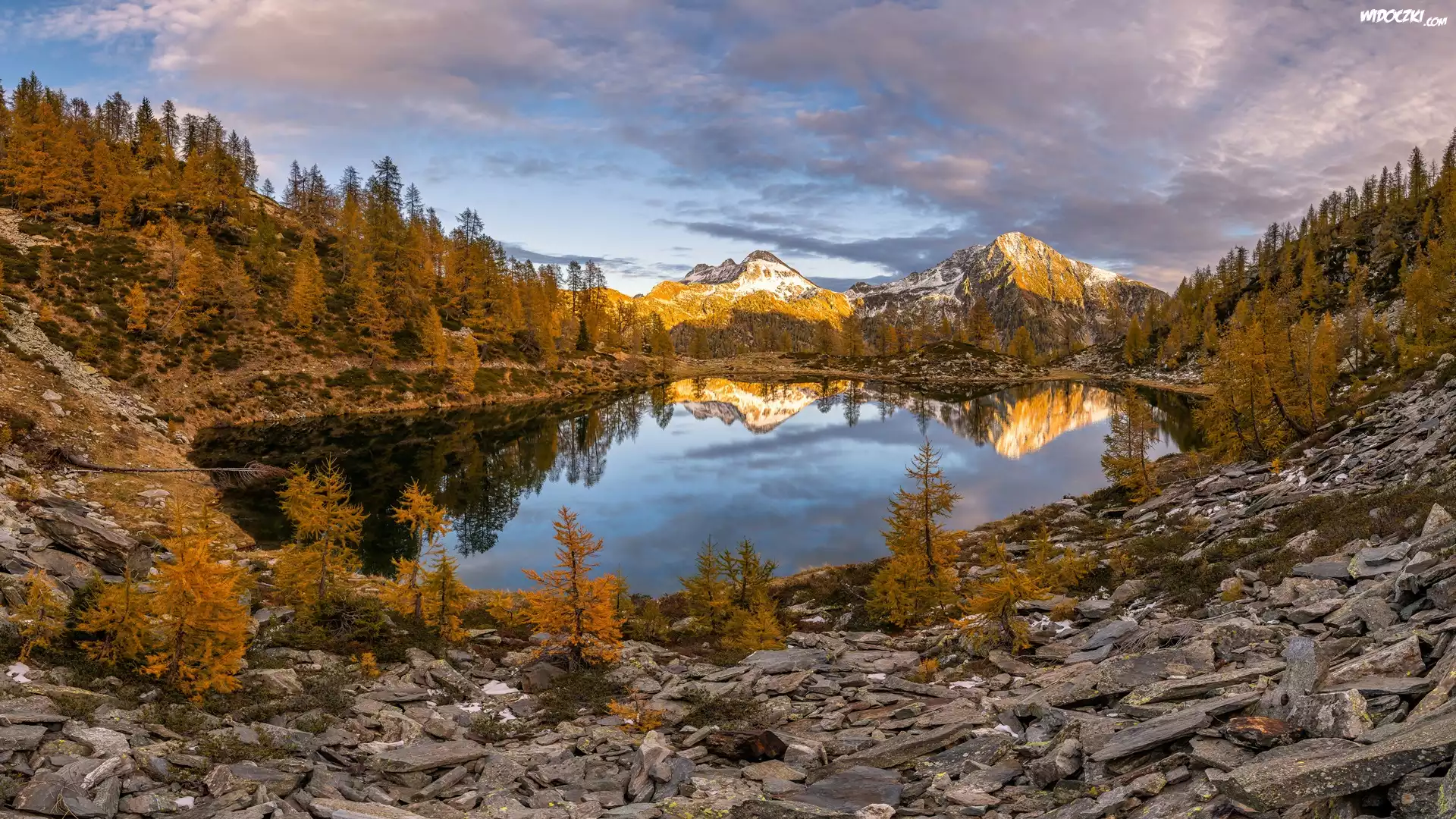 Góry, Jezioro, Kamienie, Drzewa, Jesień, Chmury