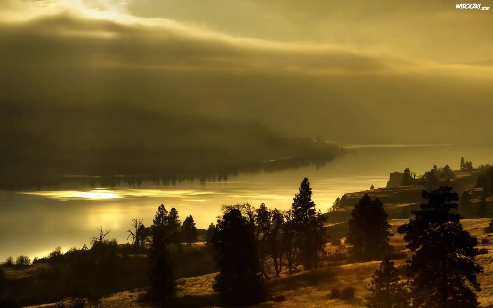 Rzeka, Góry, Drzewa, Mgła, Przebijające, Światło, Poranek, Jesień