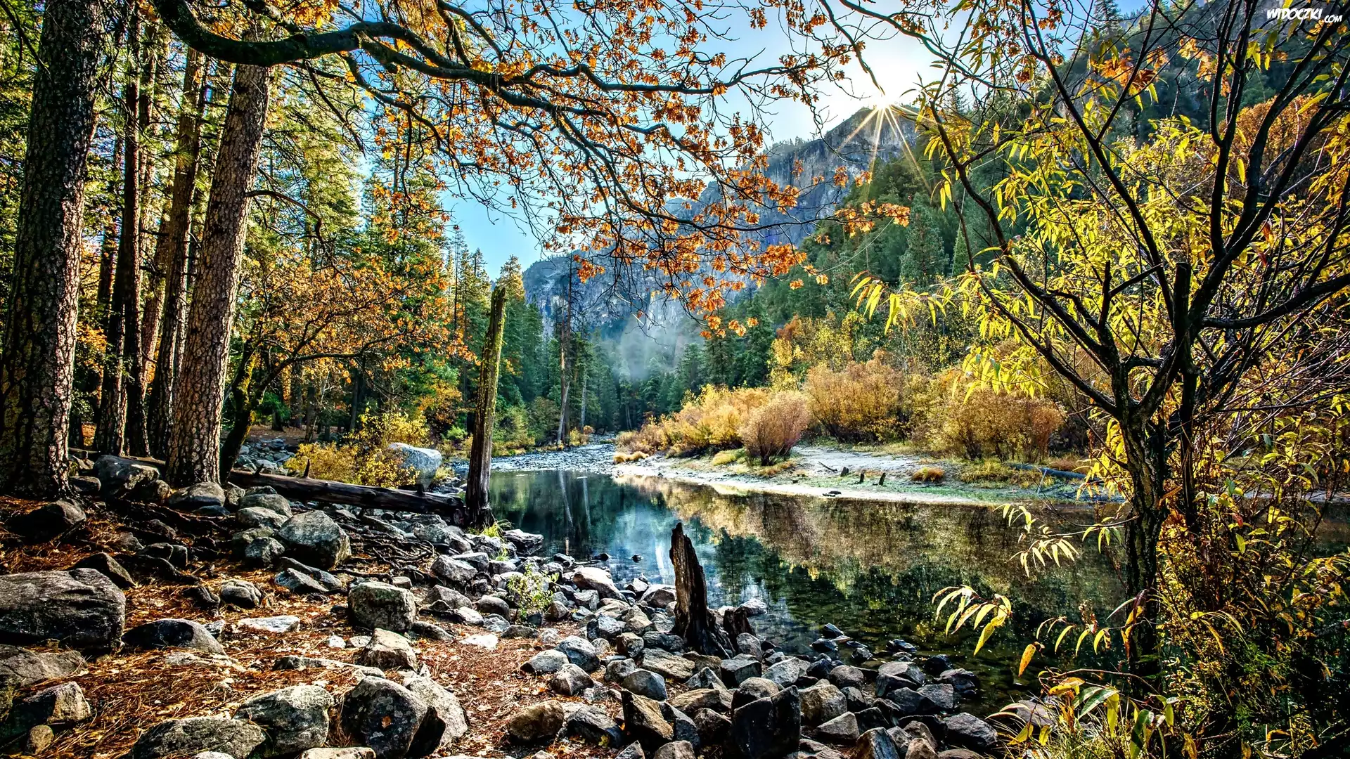 Zdjęcia, Jesień, Góry, Las, Rzeka, Kamienie, Promienie, Słońca