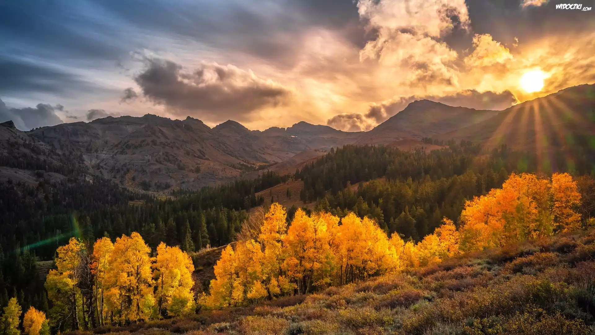 Jesień, Góry, Chmury, Drzewa, Słońce, Promienie słońca