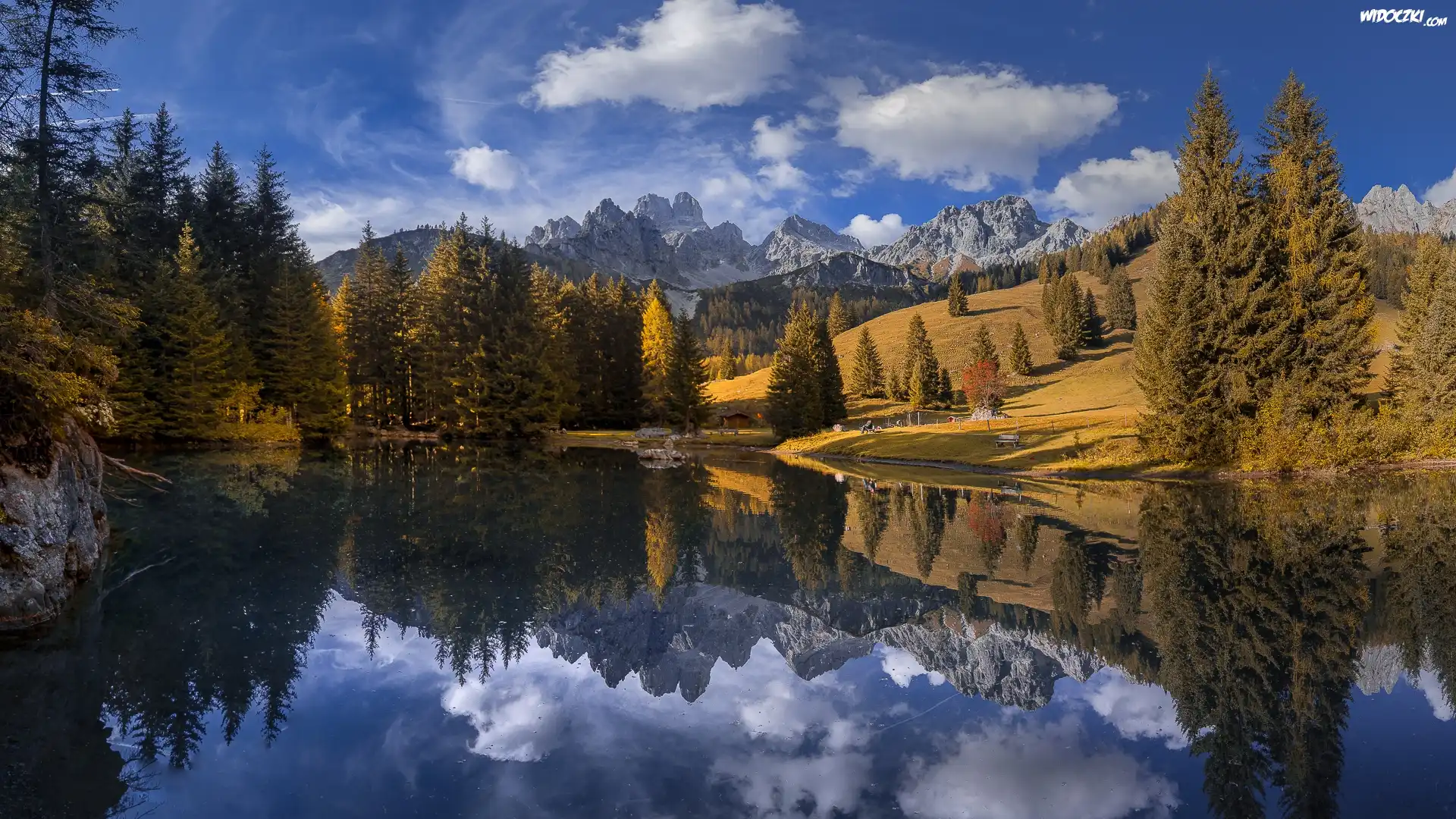 Góry, Drzewa, Chmury, Jezioro, Odbicie