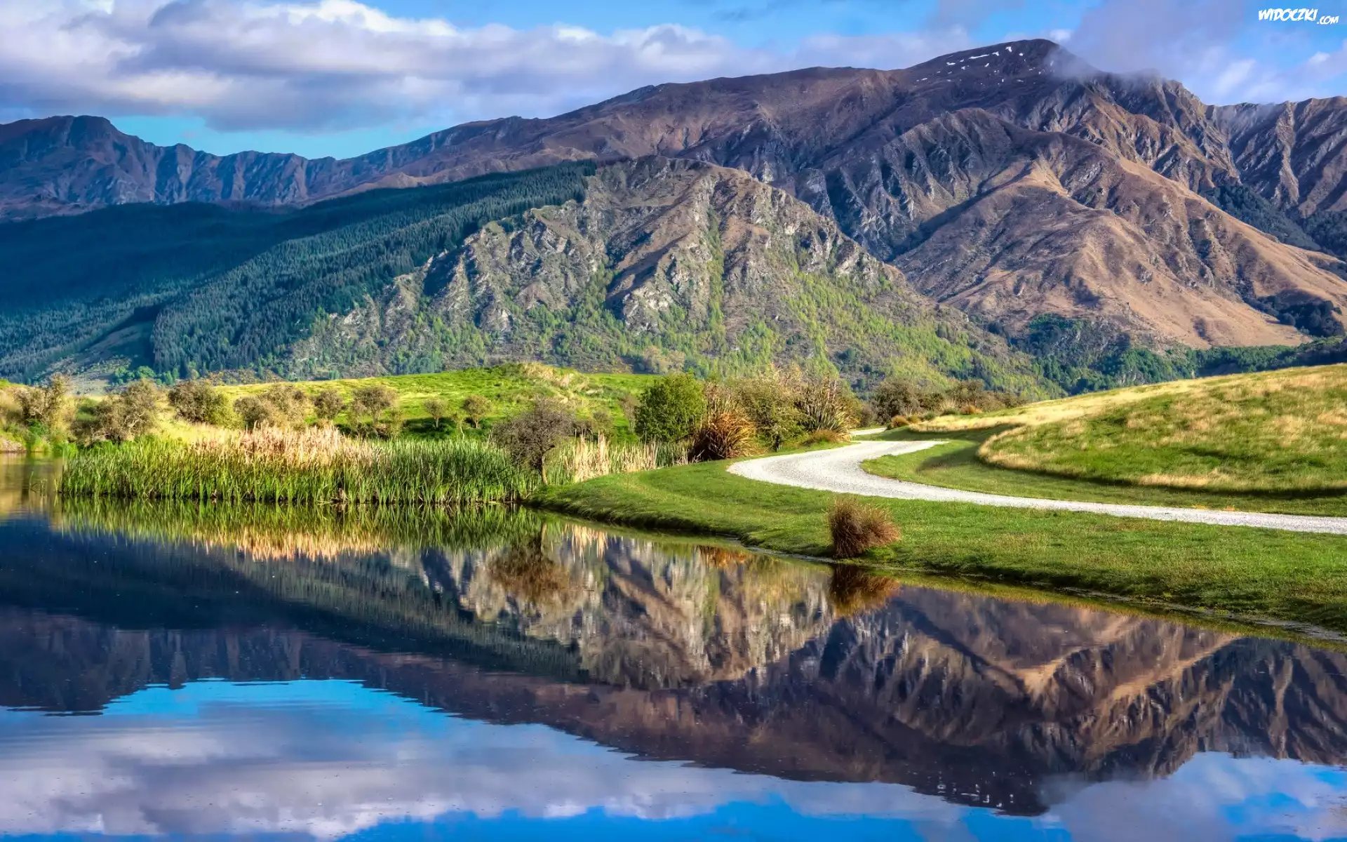 Zdjęcia, Góry, Droga, Jezioro, Drzewa