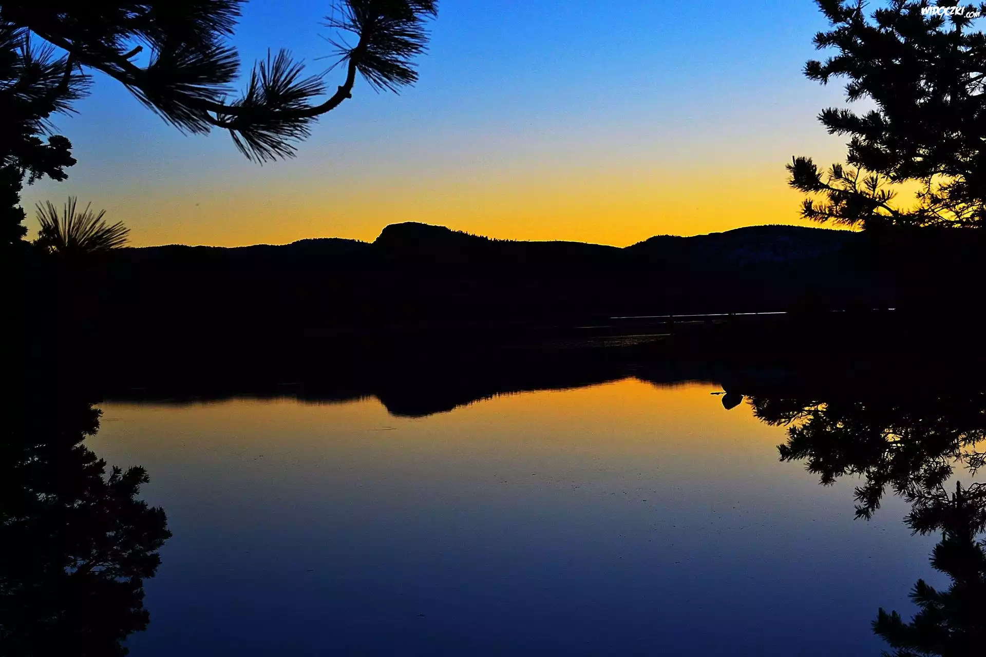Jezioro, Góry, Gałęzie, Zachód Słońca, Loon, Kalifornia