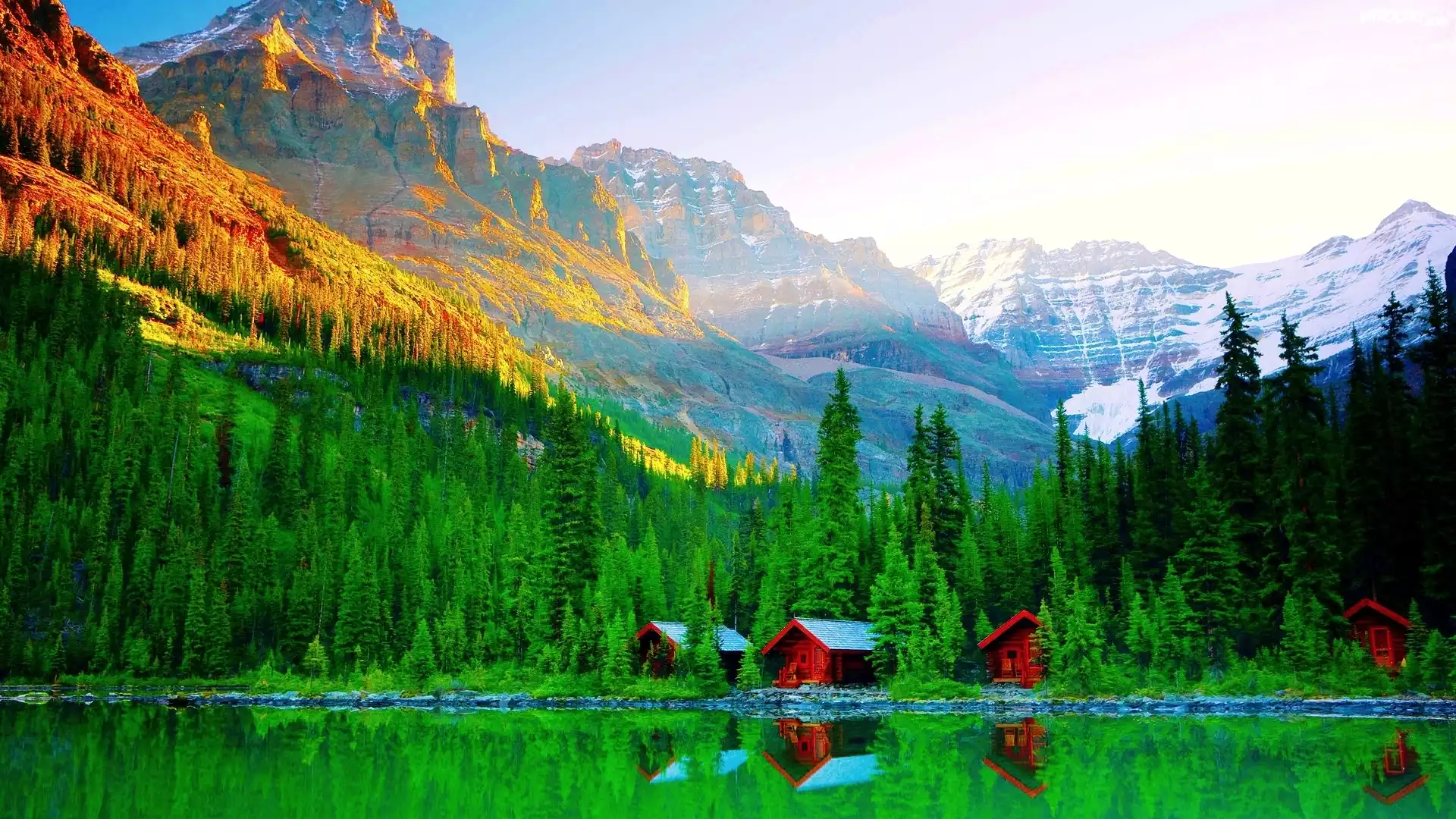 Zdjęcia, Góry, Lasy, Jezioro, Domki
