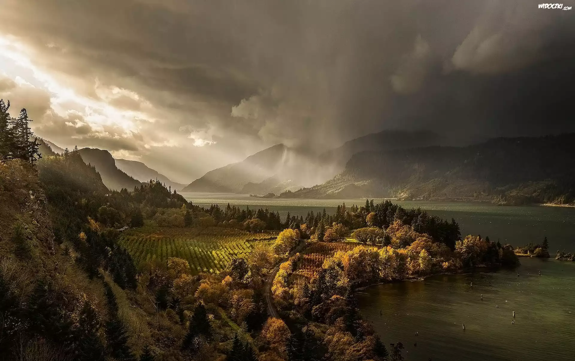 Góry, Jesień, Lasy, Pola, Jezioro, Mgła