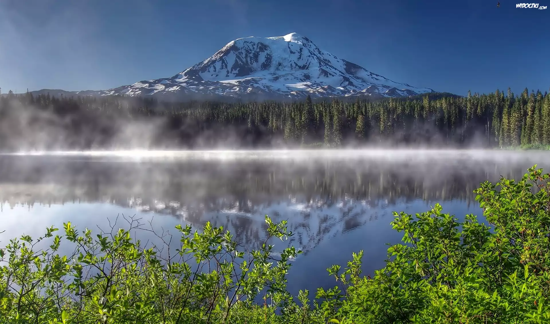 Góry, Las, Mgła, Jezioro, Krzewy