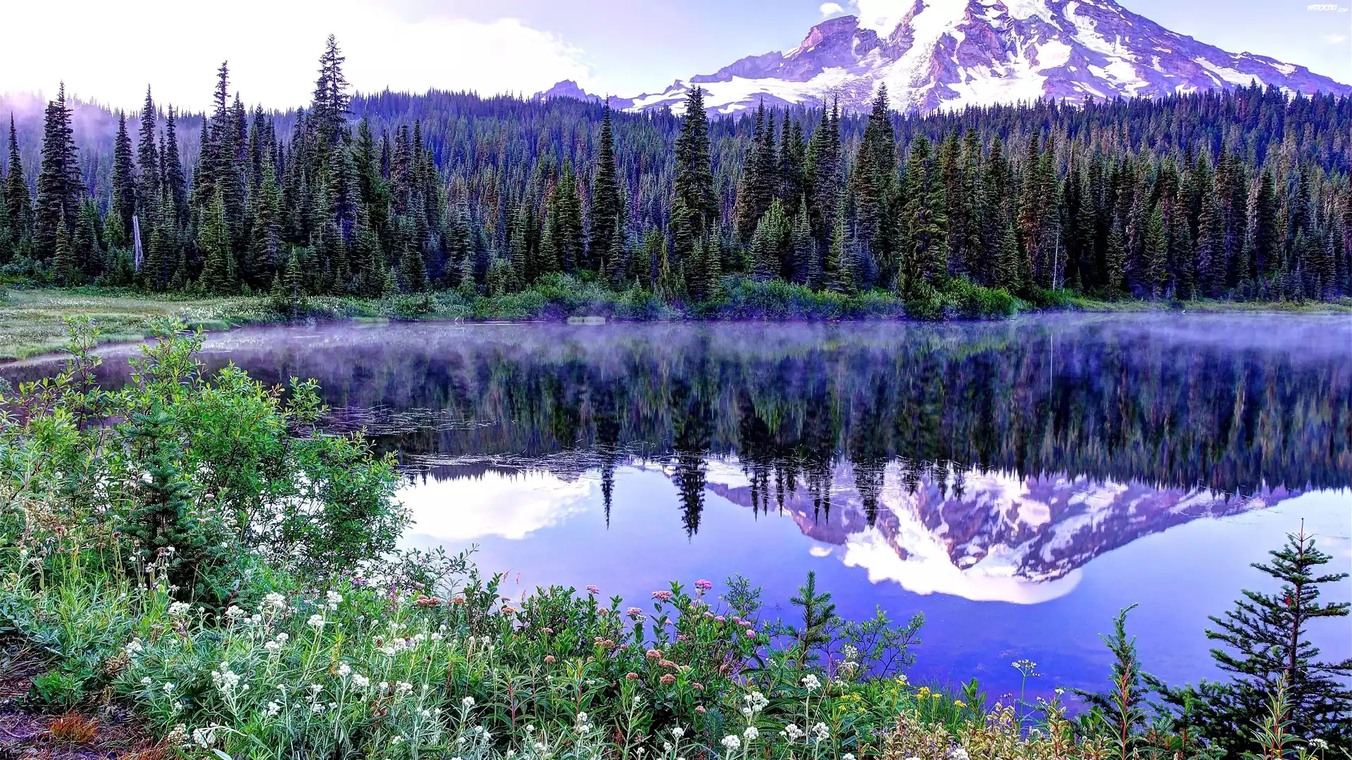 Góry, Las, Mgła, Jezioro, Kwiaty