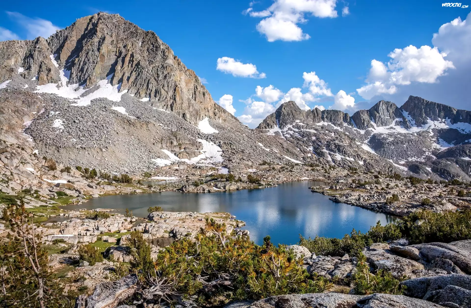 Zdjęcia, Góry, Szczyty, Śnieg, Jezioro, Rośliny