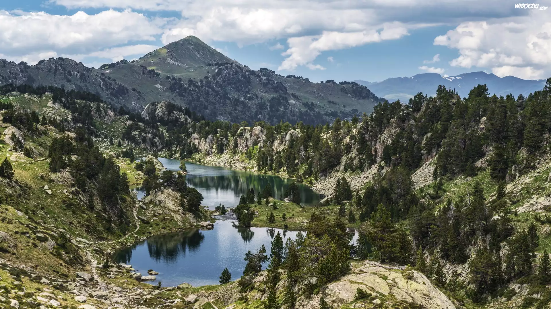 Góry, Pireneje, Jeziora, Jezioro Estanh Redon, Jezioro Colomers, Park Narodowy Aiguestortes i Estany de Sant Maurici, Drzewa, Chmury, Hiszpania |
