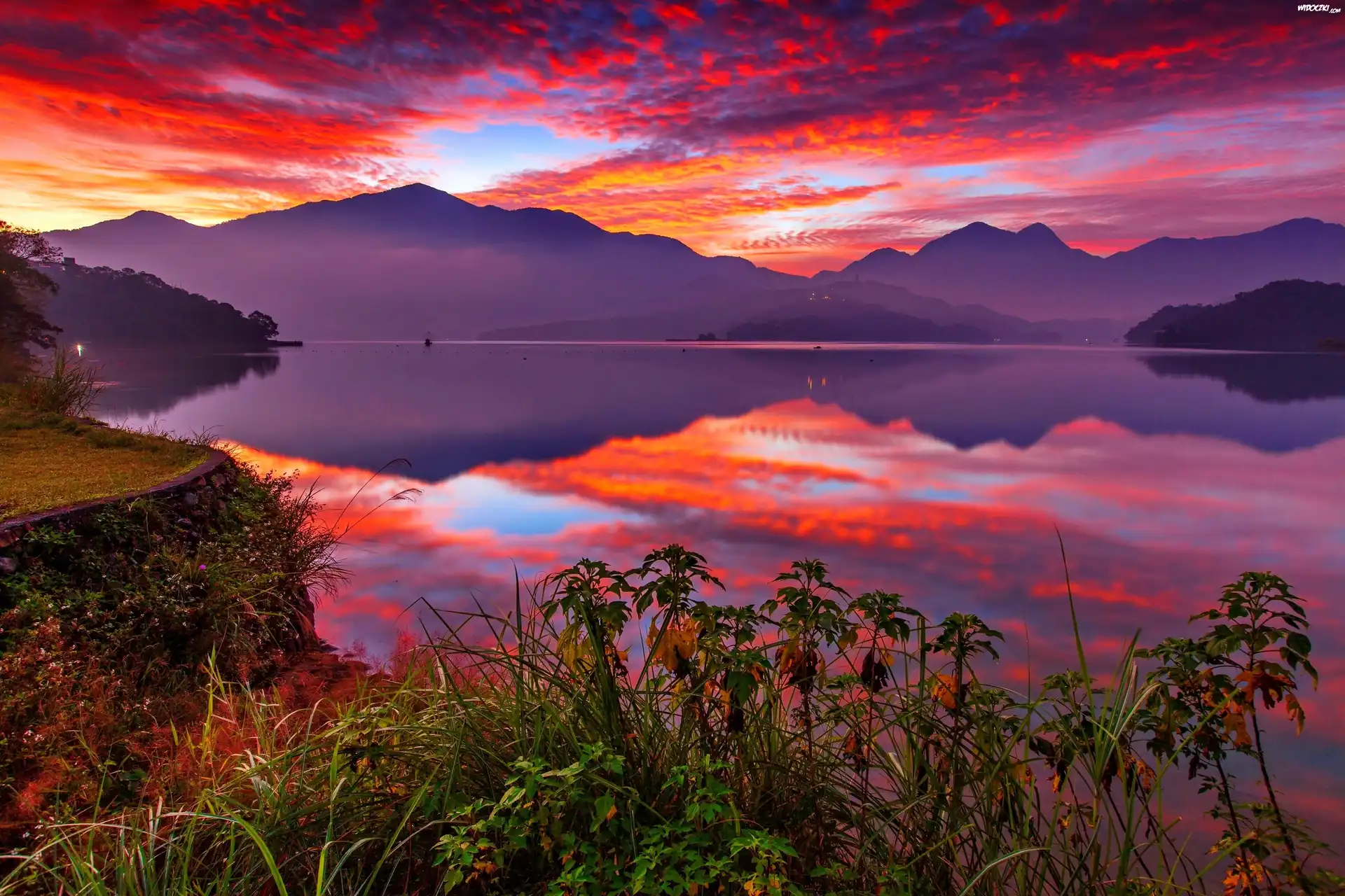 Jezioro, Góry, Roślinność, Chmury, Piękny, Zachód, Słońca