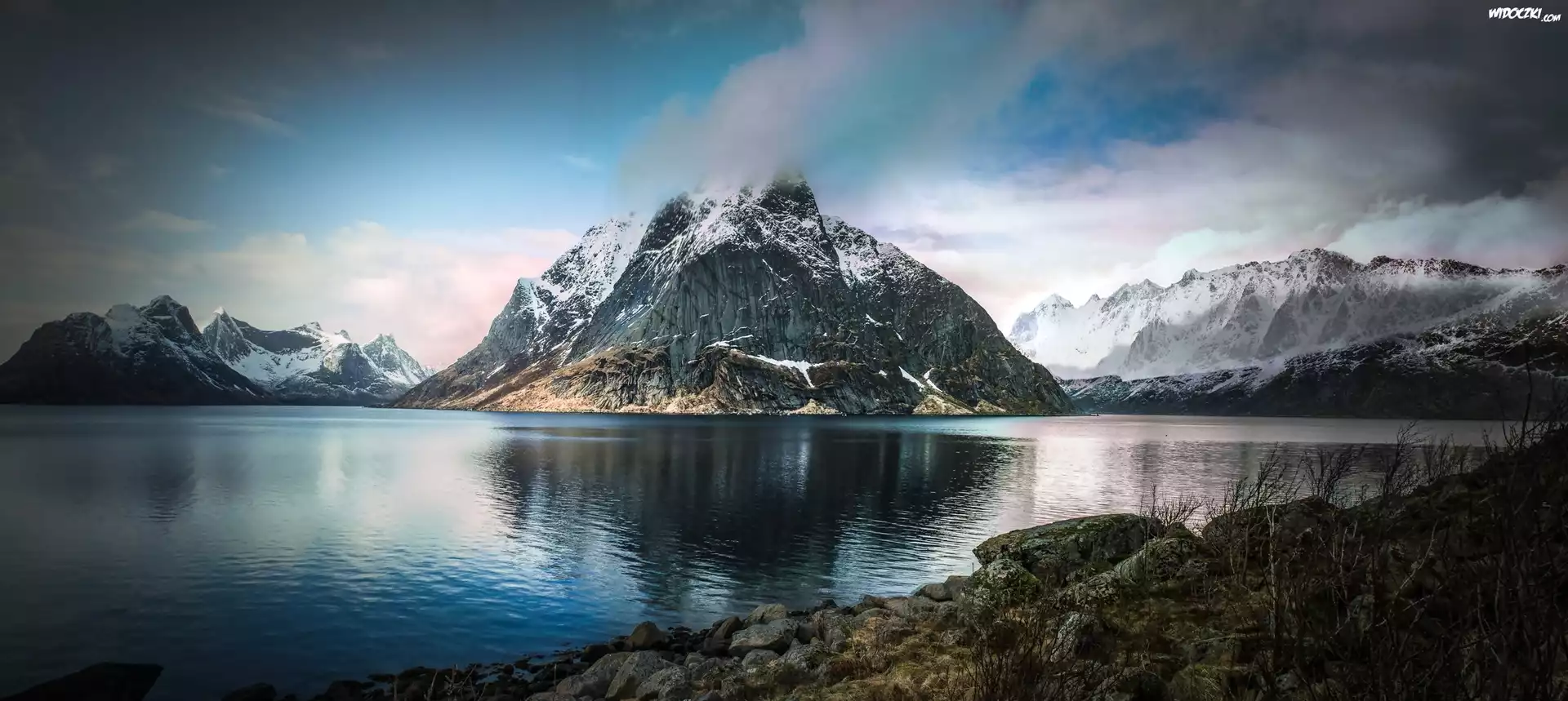 Zdjęcia, Góry, Ośnieżone, Szczyty, Jezioro, Kamienie
