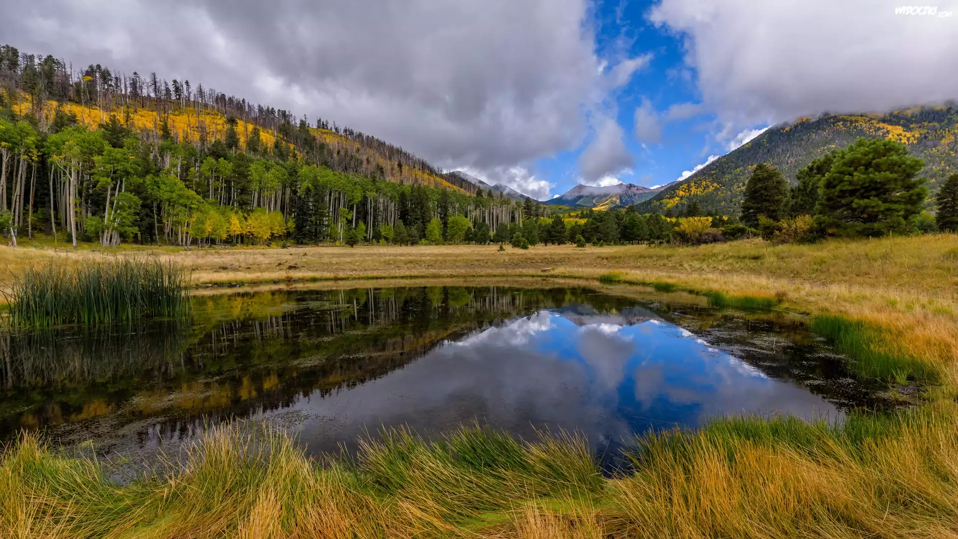 Góry, Las, Trawy, Jezioro, Chmury