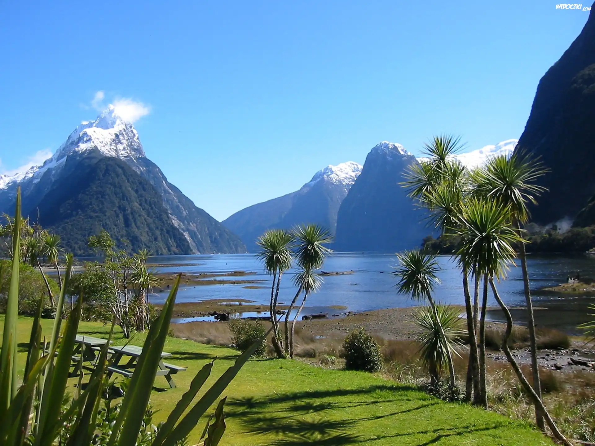 Jezioro, Góry, Roślinność, Milford Sound, Nowa Zelandia