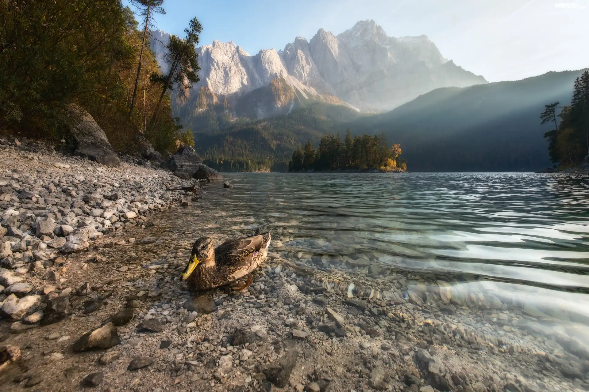 Zdjęcia, Góry, Drzewa, Jezioro, Kaczka, Kamienie