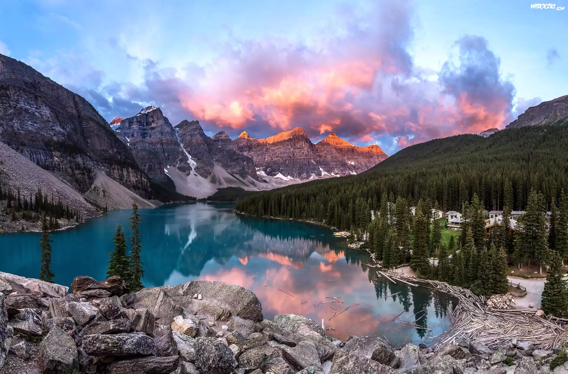 Zdjęcia, Góry, Lasy, Domy, Jezioro, Kamienie, Świt