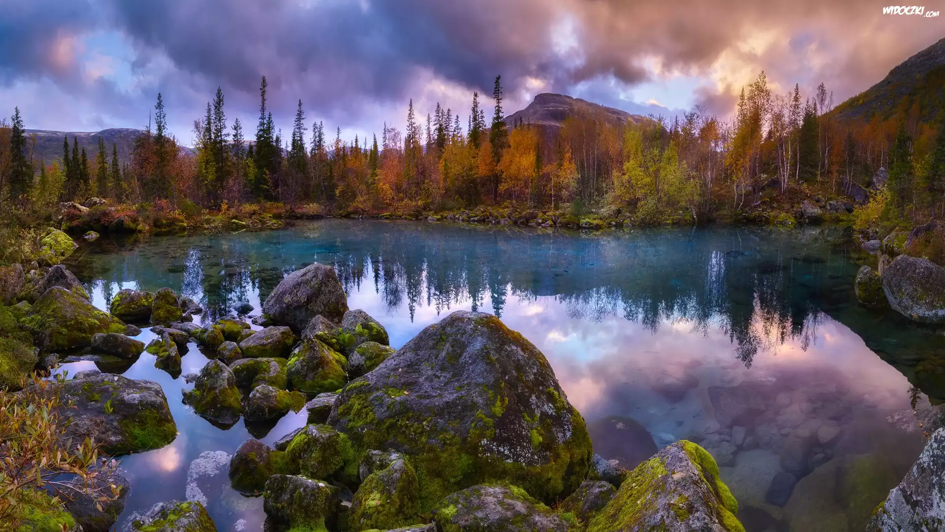 Góry, Jezioro, Drzewa, Kamienie, Chmury