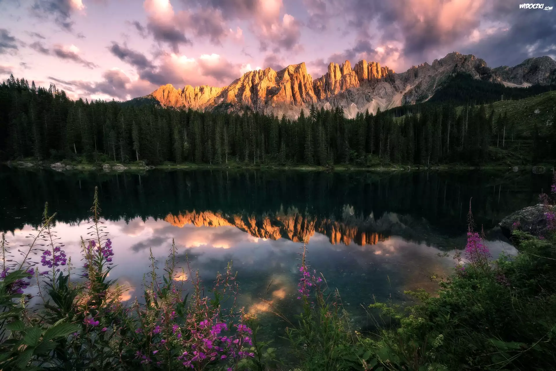 Zdjęcia, Góry, Las, Drzewa, Jezioro, Odbicie, Brzeg, Rośliny, Kwiaty, Kamienie, Chmury
