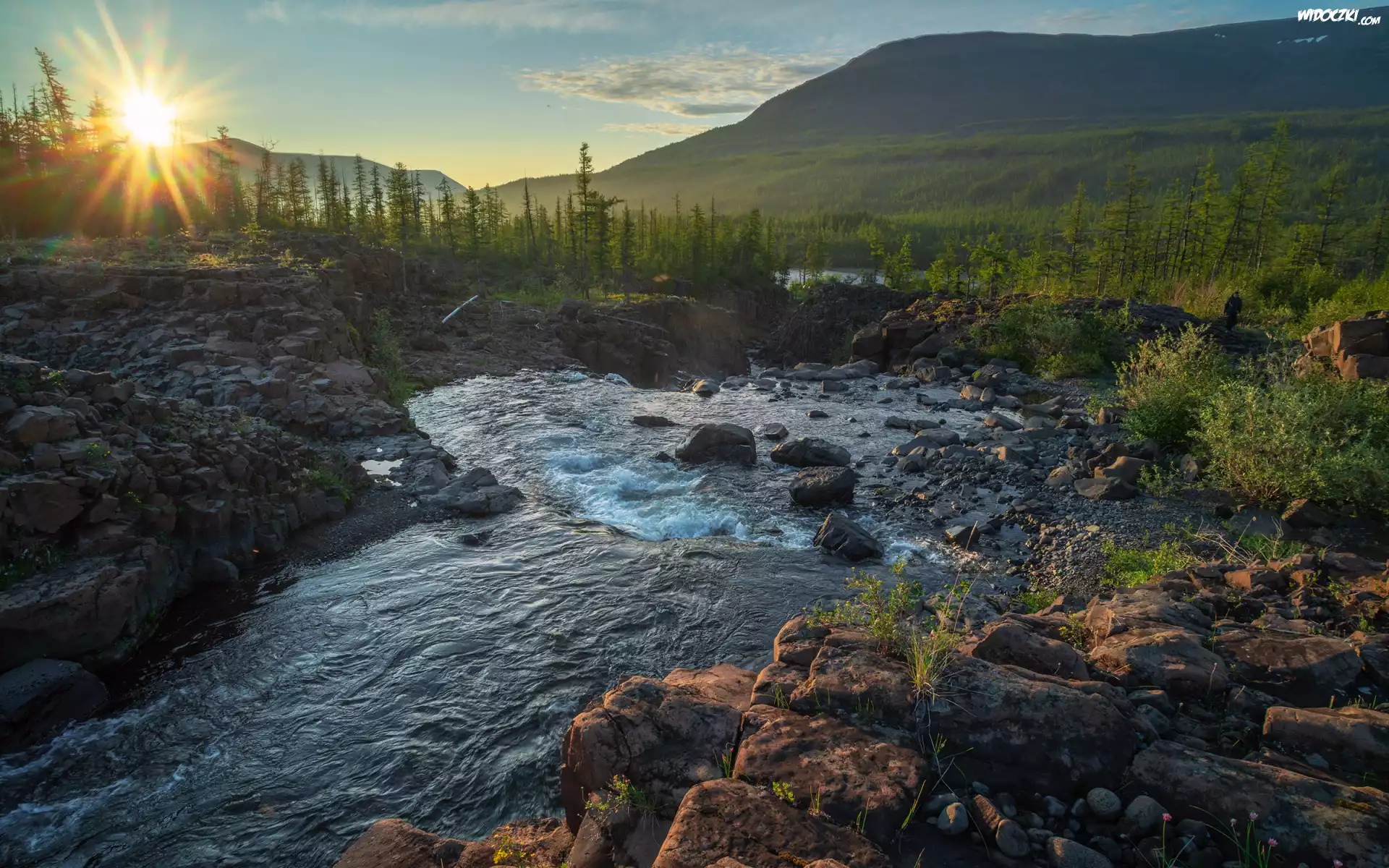 Góry, Skały, Rzeka, Kamienie, Słońce, Drzewa, Rezerwat Putorański, Płaskowyż Putorana, Kraj Krasnojarski, Rosja |