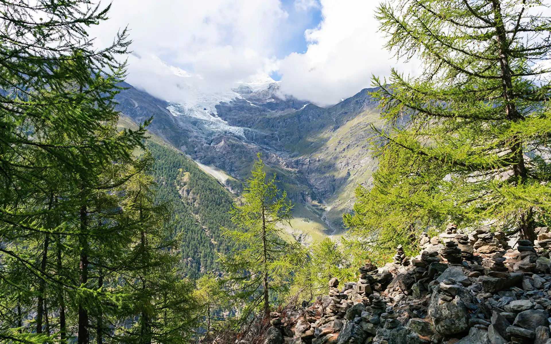 Góry, Dolina, Drzewa, Świerki, Kamienie, Chmury