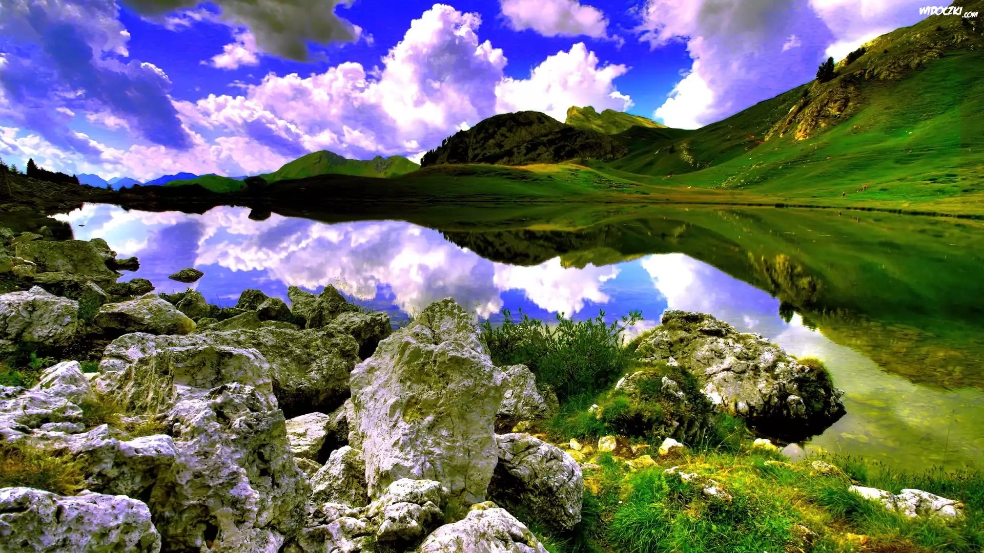 Zdjęcia, Góry, Jezioro, Kamienie, Chmury