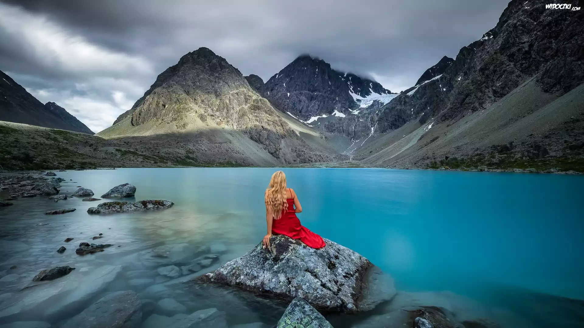 Zdjęcia, Góry, Jezioro, Kobieta, Kamienie, Chmury