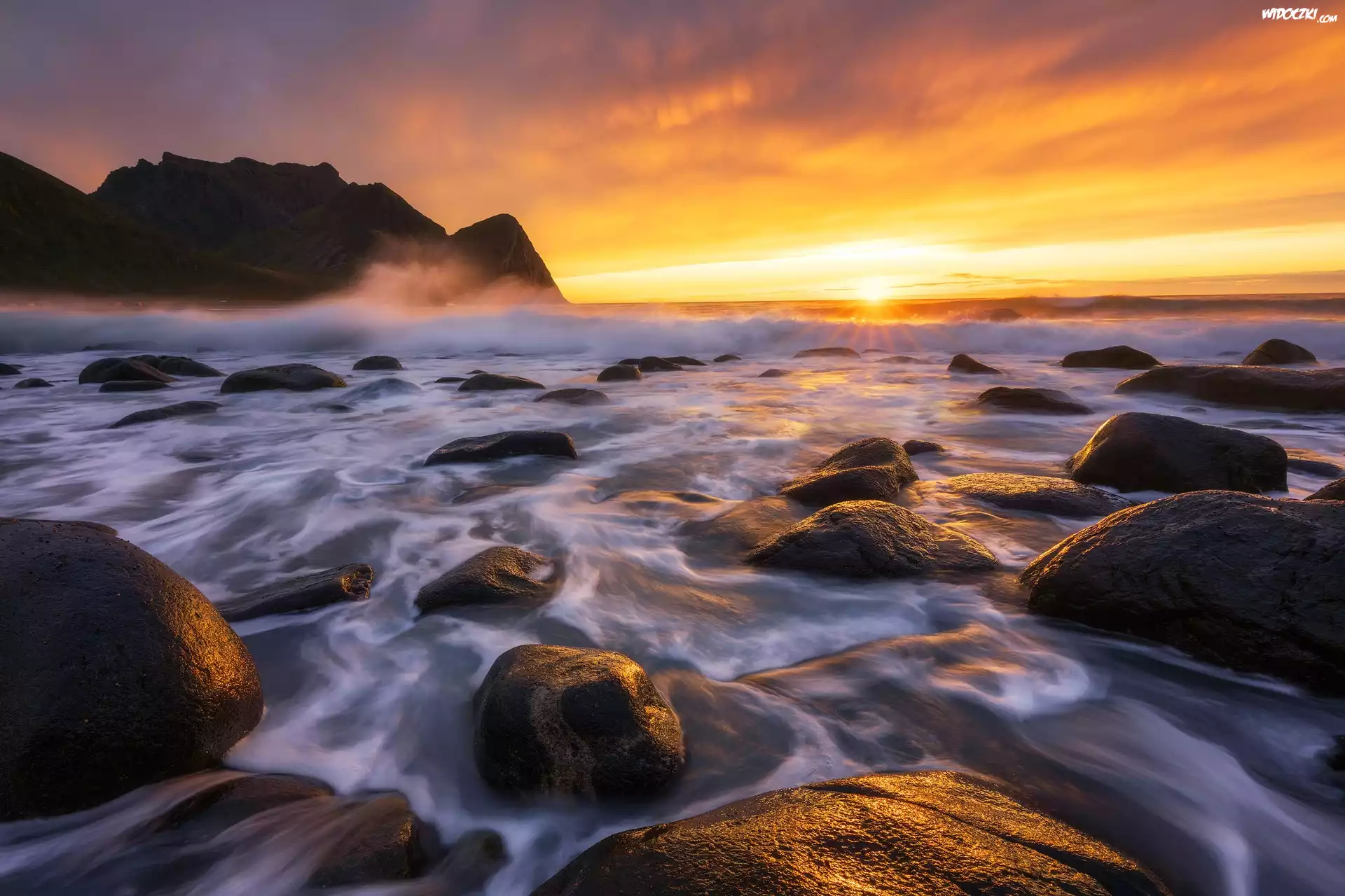 Zdjęcia, Morze, Góry, Kamienie, Zachód słońca