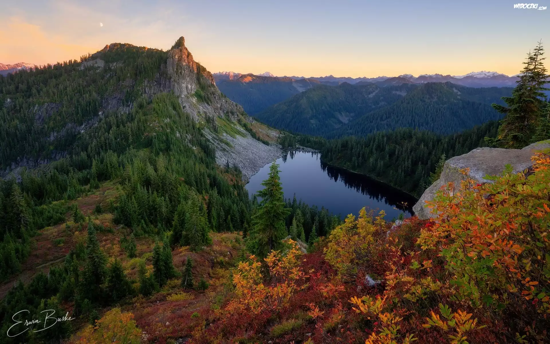 Zdjęcia, Góry, Jezioro, Skały, Drzewa, Kolorowa, Roślinność