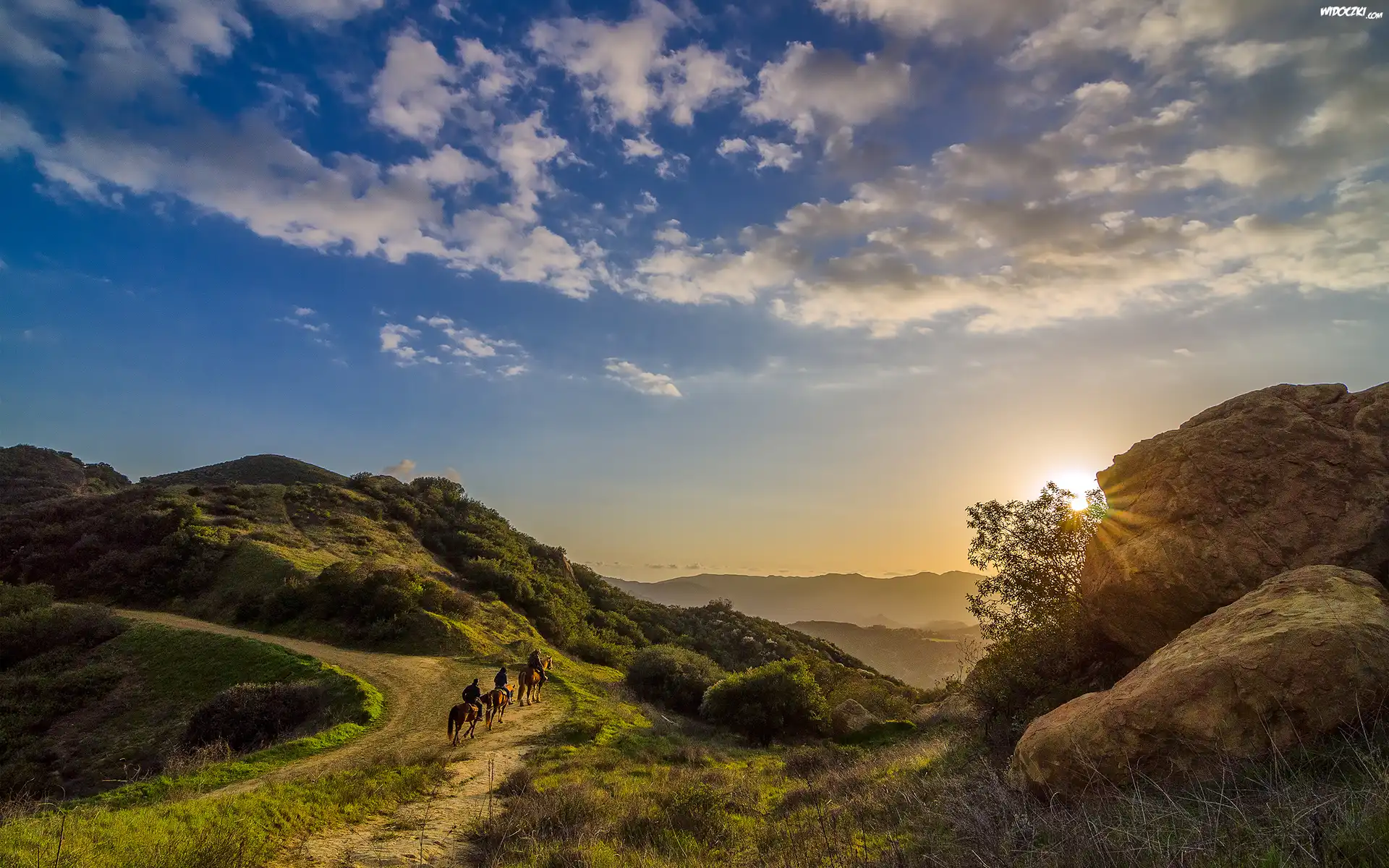 Góry, Promienie, Słońca, Droga, Konie, Jeźdźcy