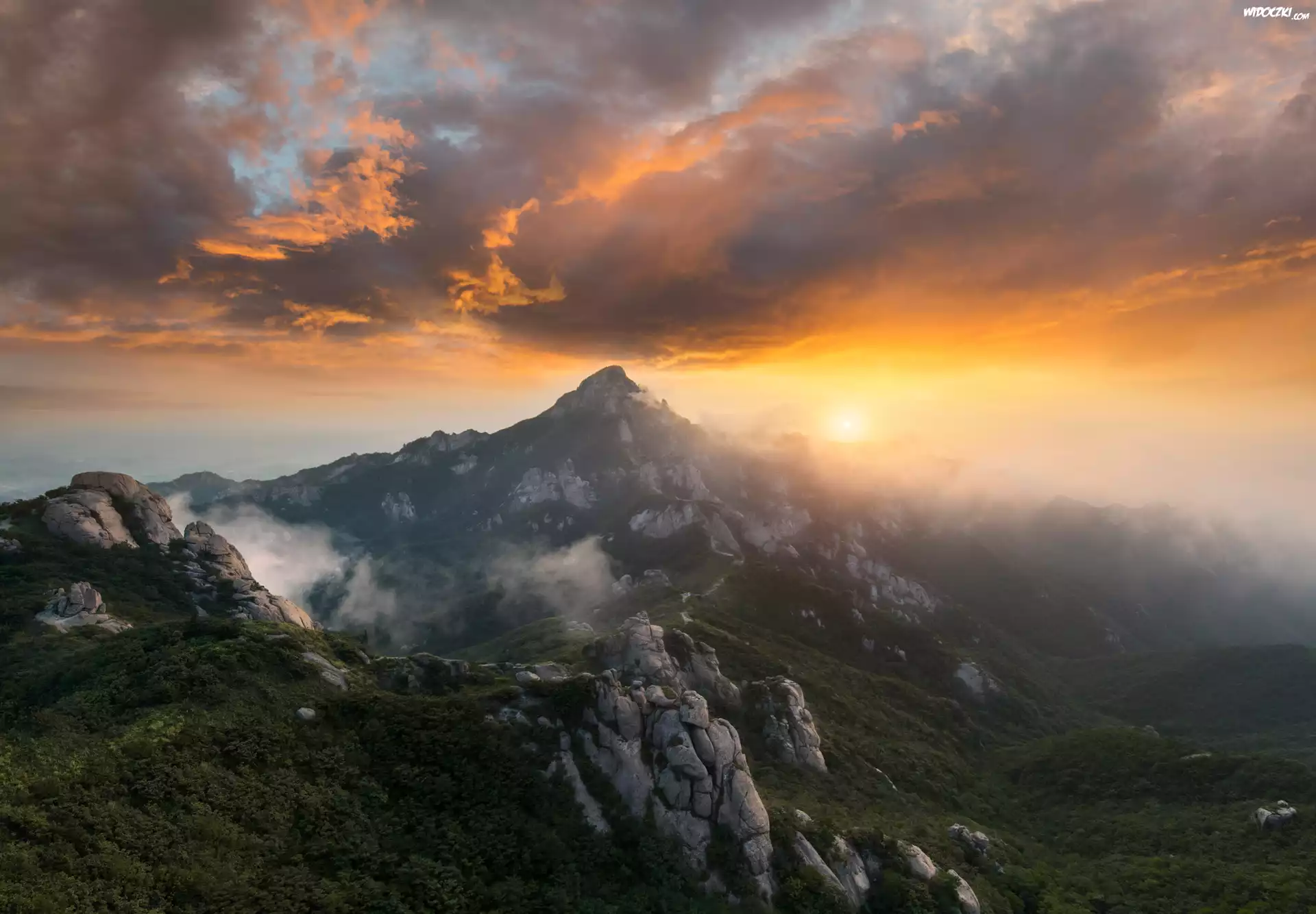 Zdjęcia, Korea Południowa, Park Narodowy Wolchulsan, Góry Wolchulsan, Skały, Chmury, Wschód słońca, Mgła