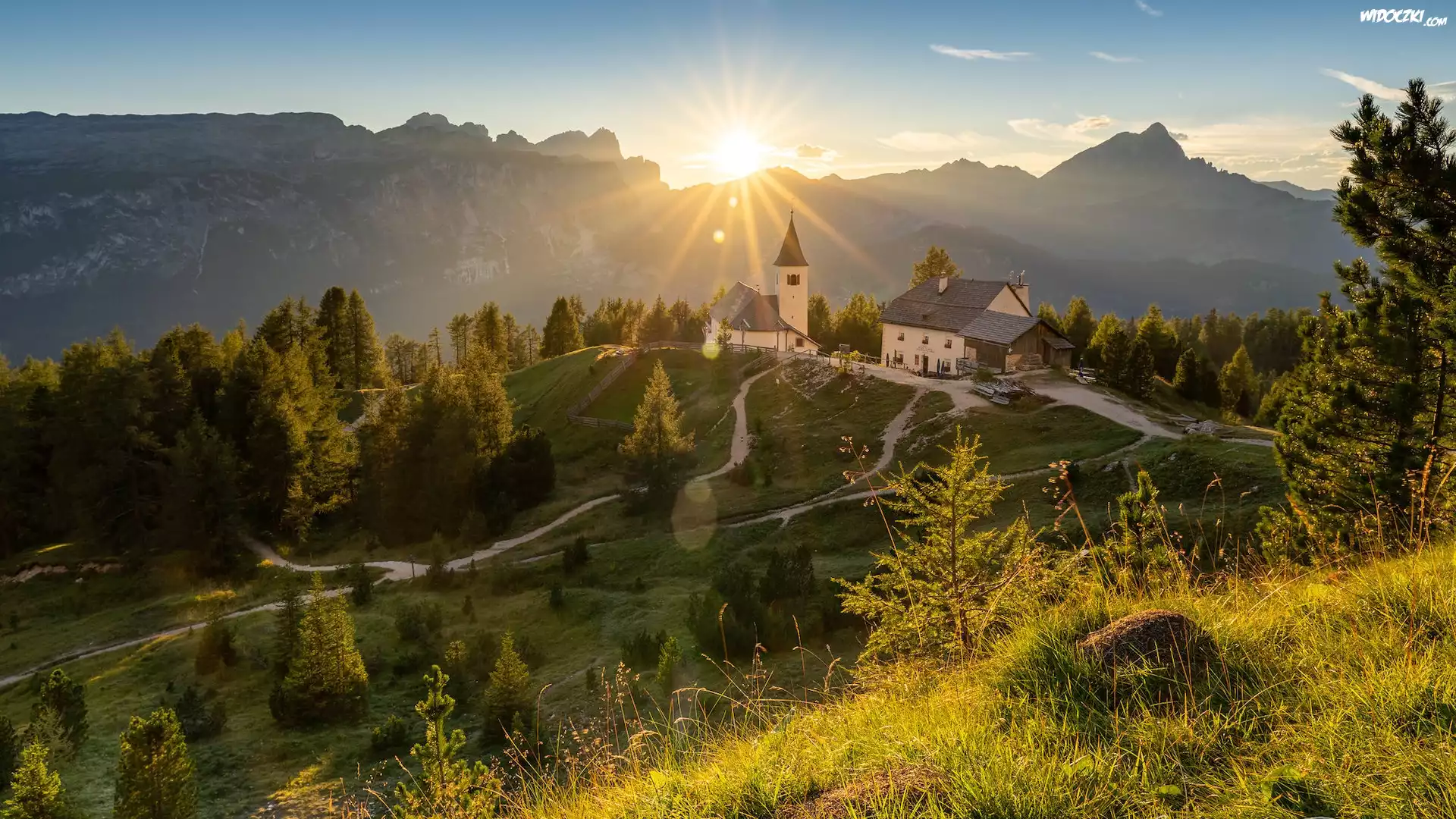 Zdjęcia, Góry, Dolomity, Wzgórze, Kościół św Krzyża, Promienie słońca, Alta Badia, Południowy Tyrol, Włochy