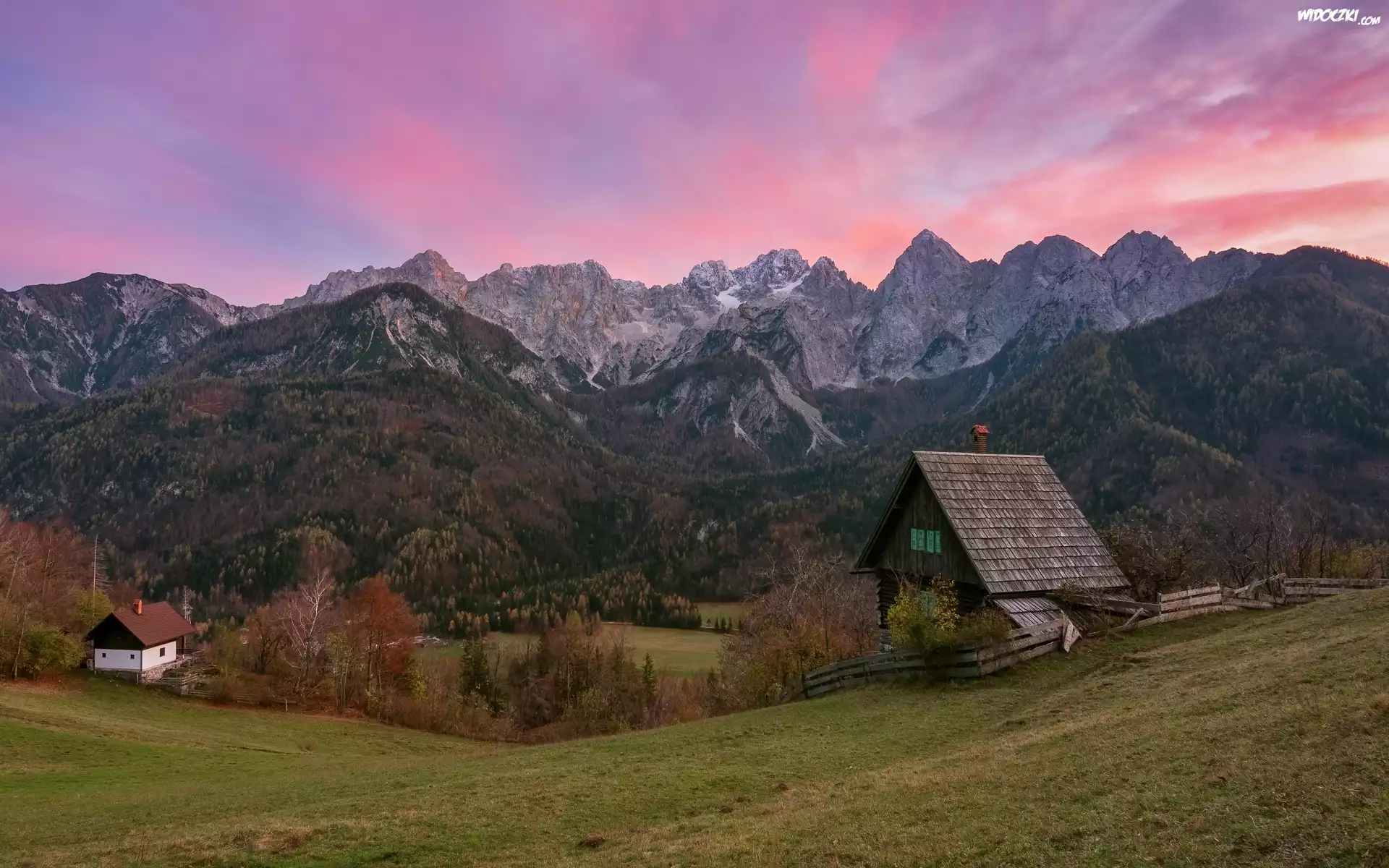 Zdjęcia, Góry, Alpy Julijskie, Las, Drzewa, Domy, Kranjska Gora, Słowenia