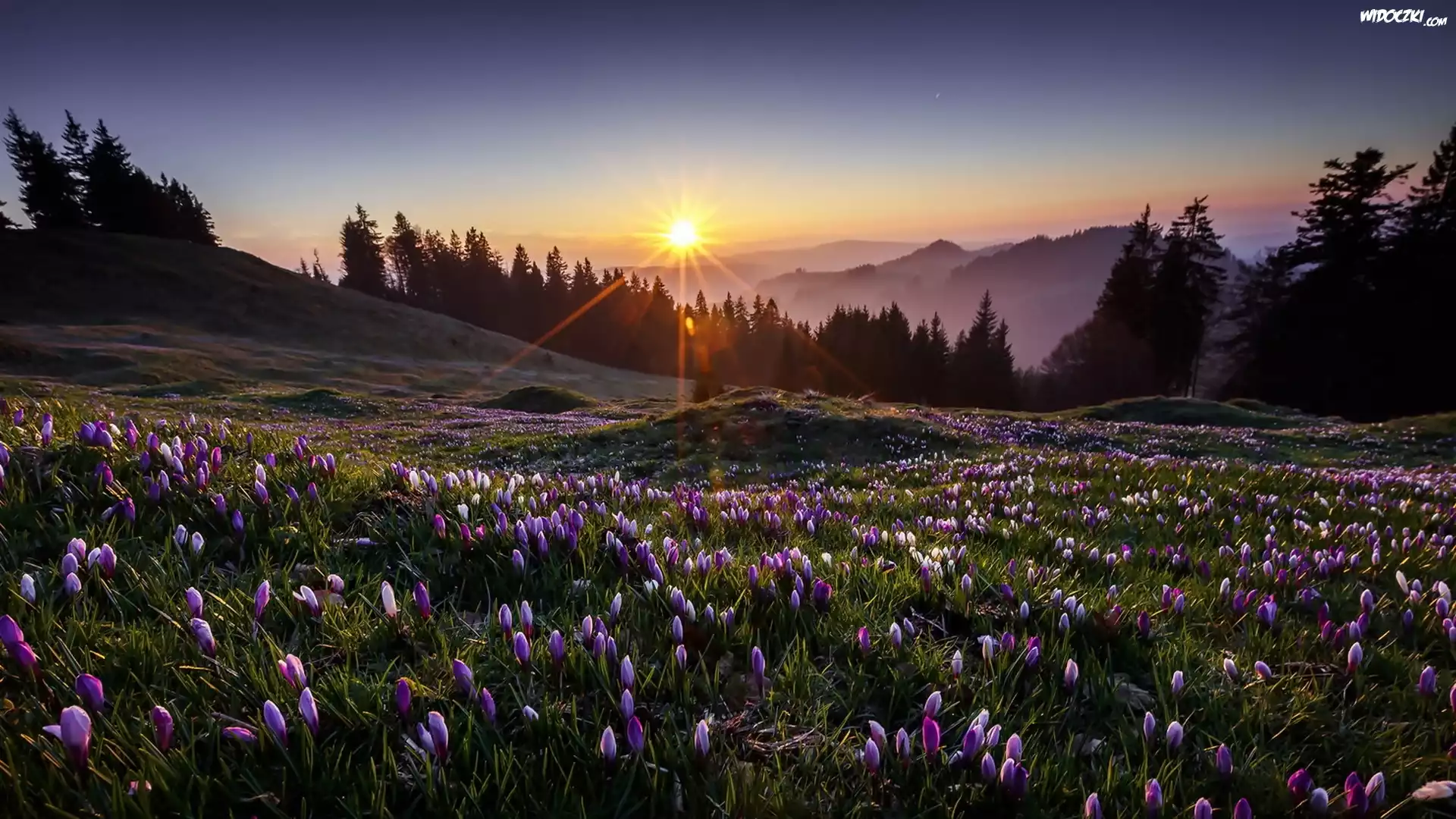 Zdjęcia, Łąka, Krokusy, Góry, Świt