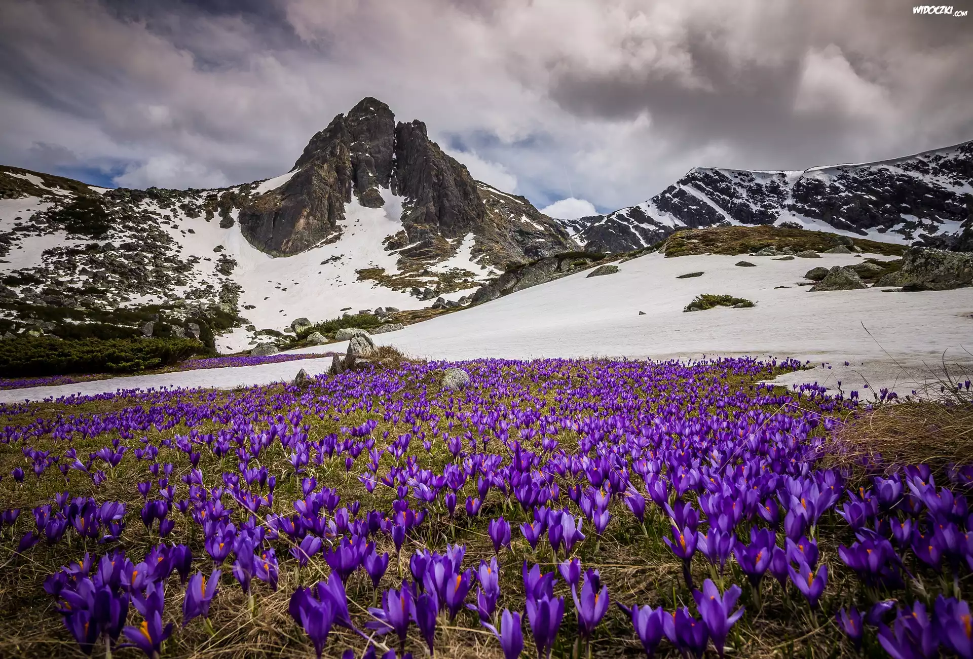 Zdjęcia, Góry, Zima, Chmury, Krokusy, Łąka