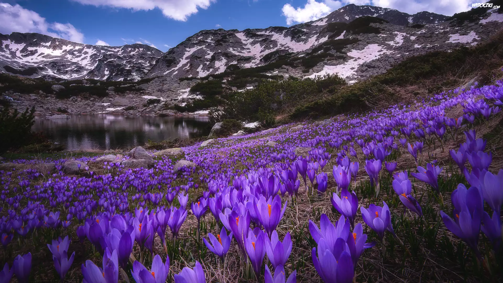 Zdjęcia, Krokusy, Polana, Jezioro, Góry