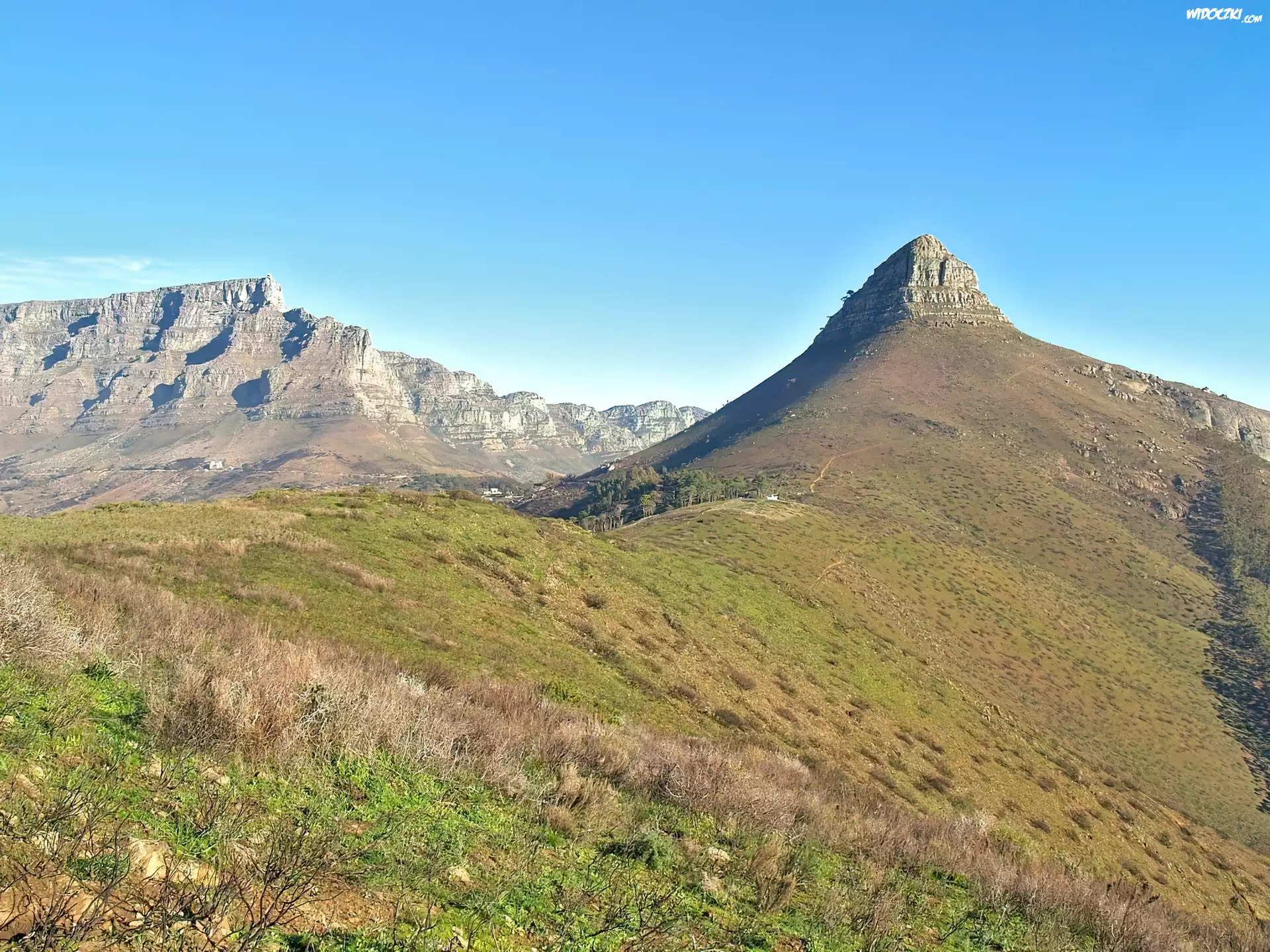 Góry, łąka, Krzew, Niebo