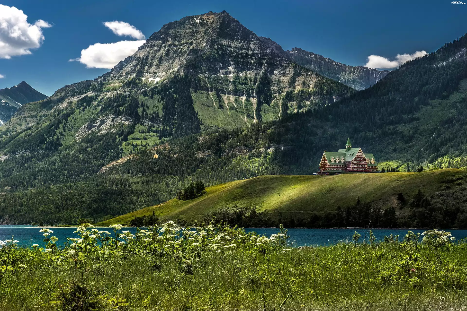 Góry, Rzeka, Łąka, Kwiaty, Dom