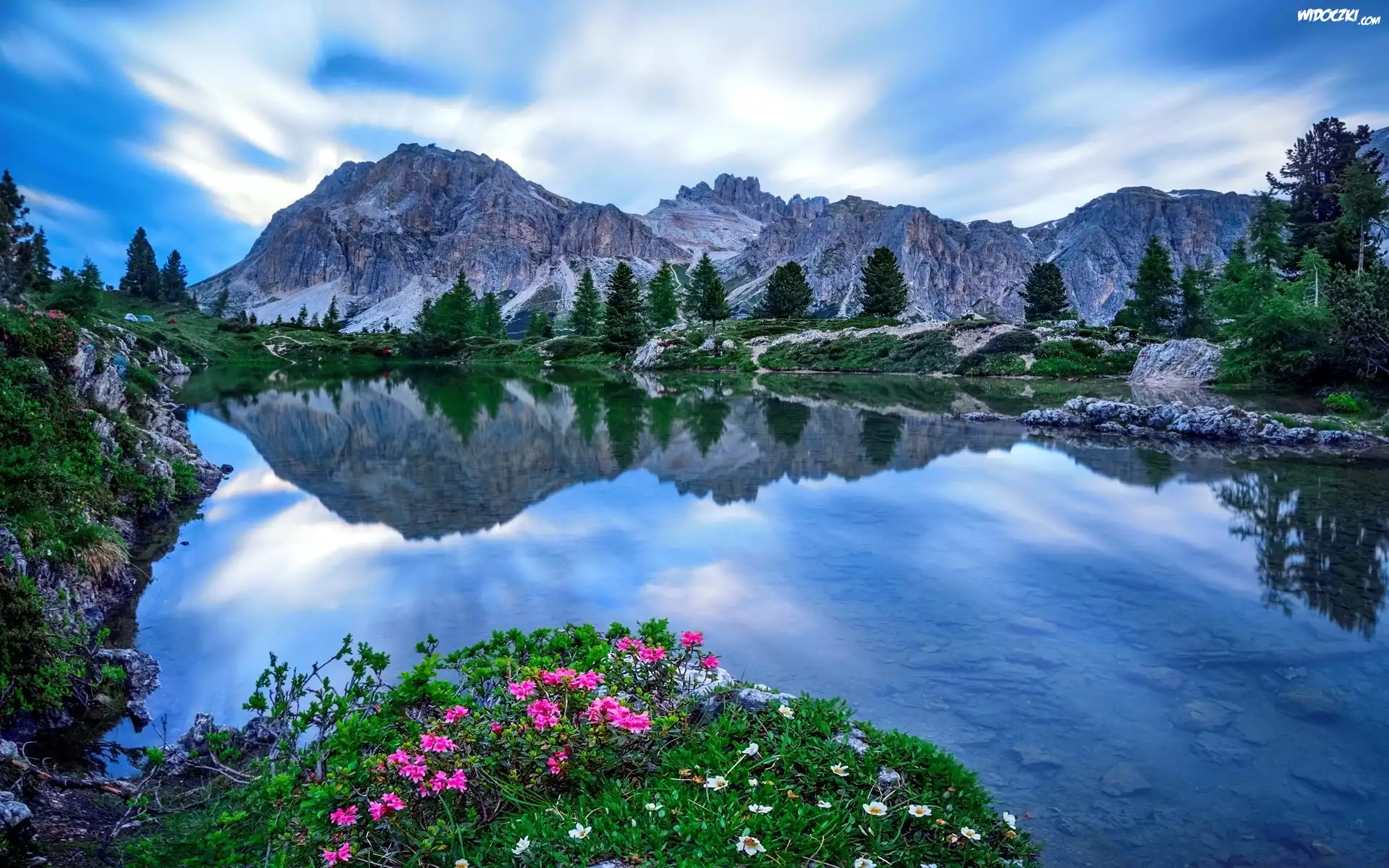 Zdjęcia, Góry, Jezioro, Drzewa, Różowe, Kwiaty, Odbicie